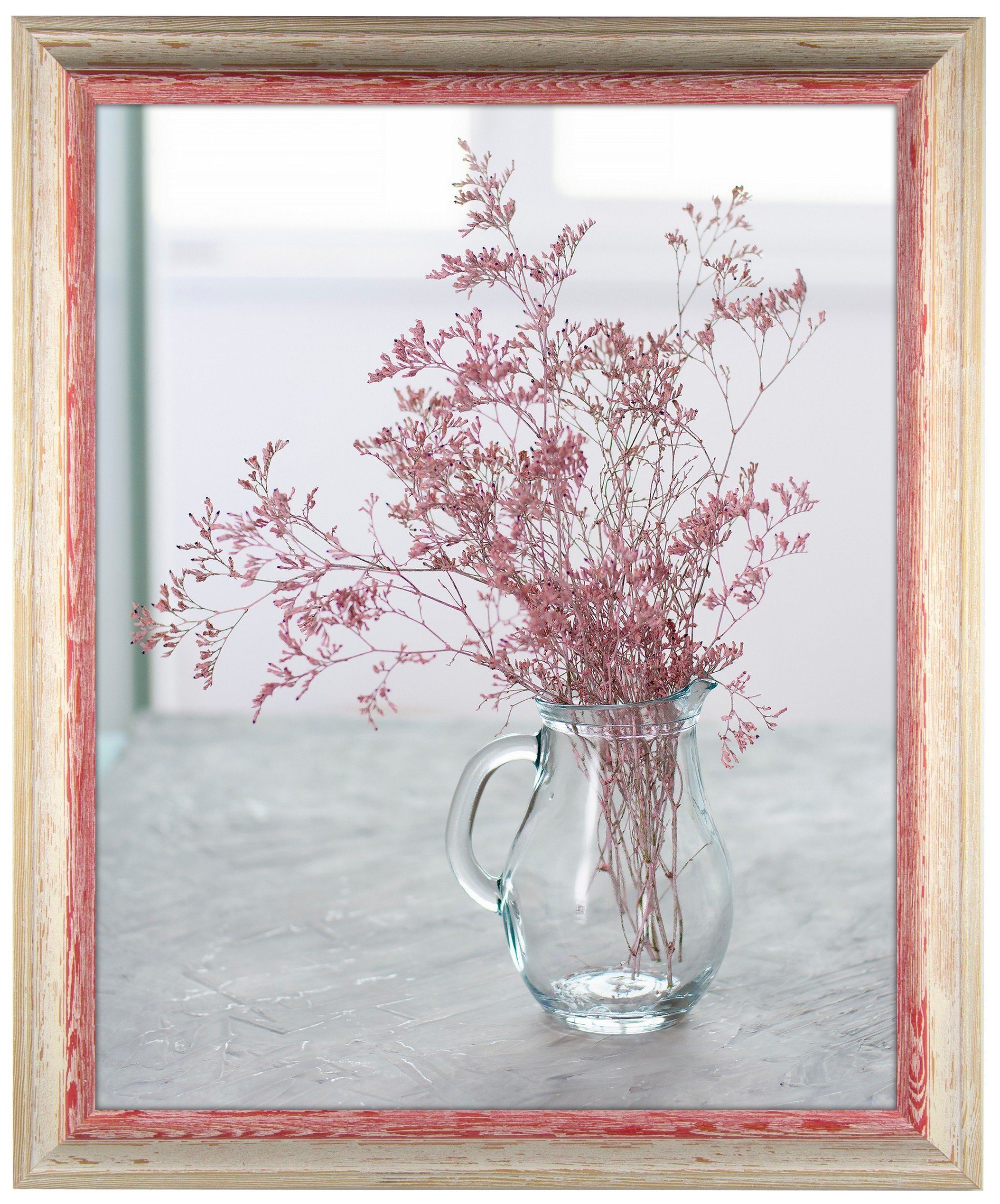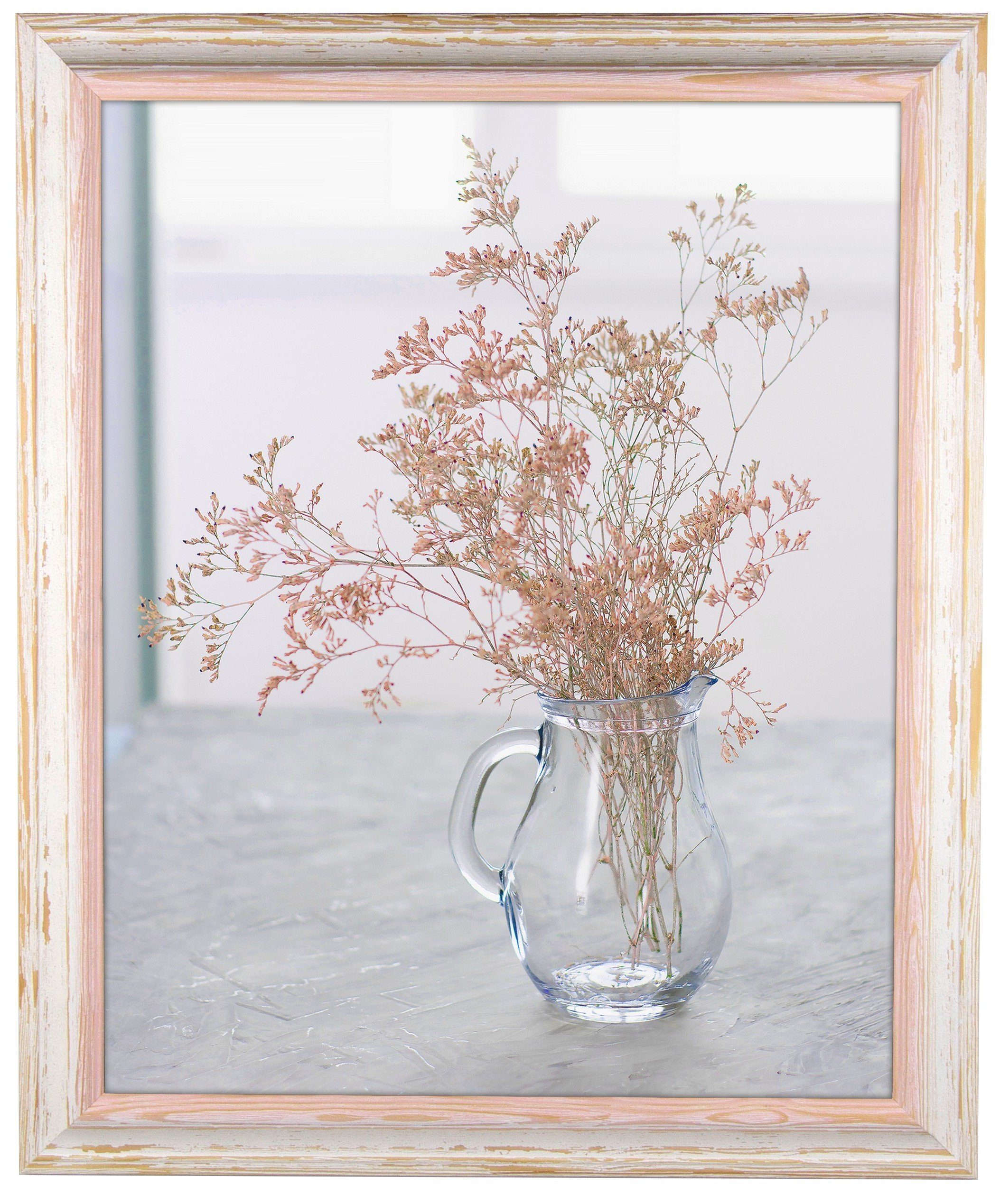 Bilderrahmen mit Kunstglas. Rückwand mit Aufhängern. Es wird kein Passepartout bzw. Hintergrundpapier mitgeliefert. Das angezeigte Motiv ist nicht im Lieferumfang enthalten.