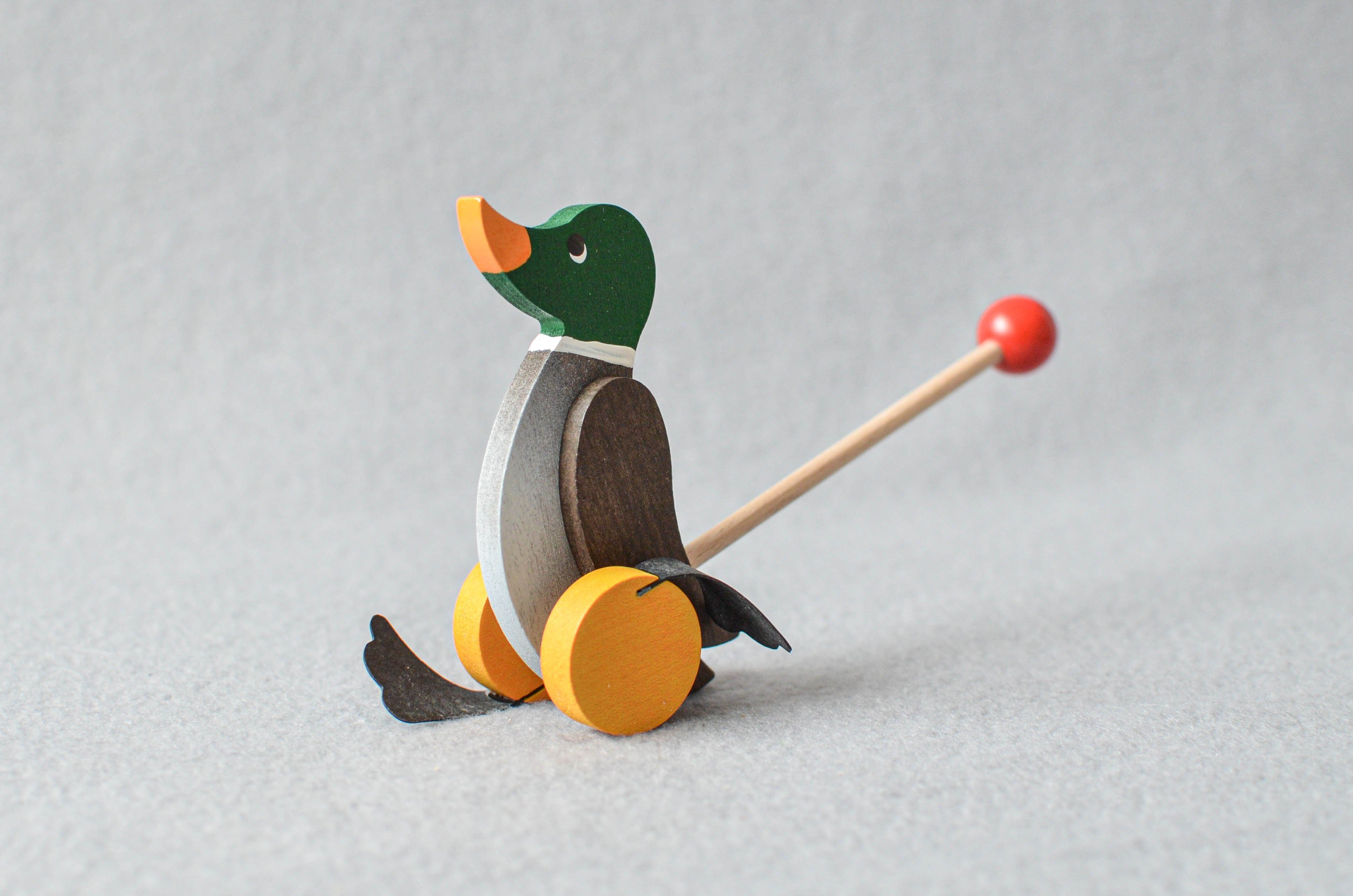 Holzspielzeug Watscheltier Ente Das Schiebetier hat eine Розмір vom ca. 8 cm und ist komplett aus Holz gefertigt. Die Ente ist bunt bemalt und hat einen Schiebestab mit Kugel. Räder besitzt die Ente an der Unterseite. Diese sind mit Gummistreifen versehen die beim schieben auf den Boden klatschen. Gefertigt wird alles in verschiedenen Arbeitsschritten komplett in Seiffen in einem kleinen Familienbetrieb Höhe=8cm NEU |