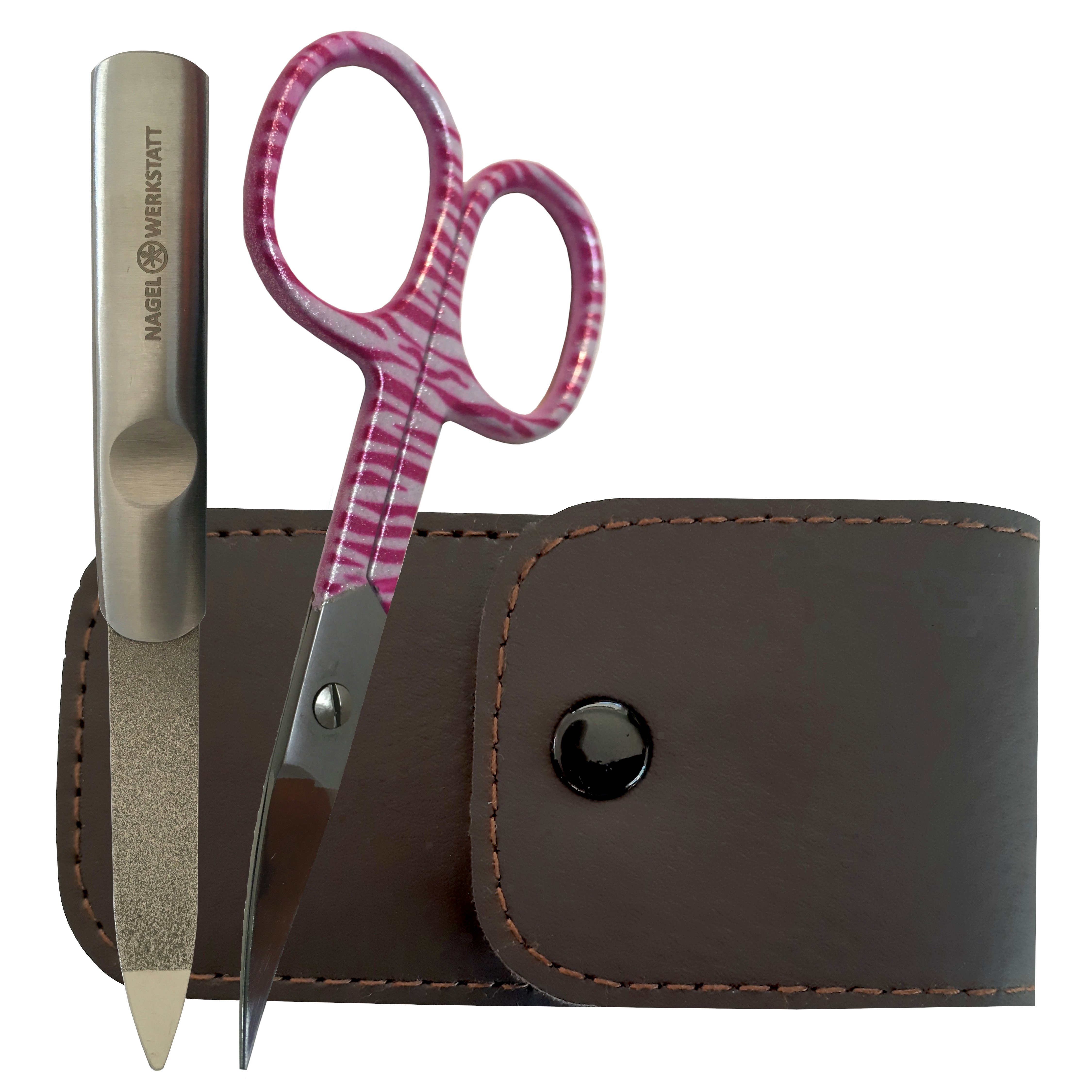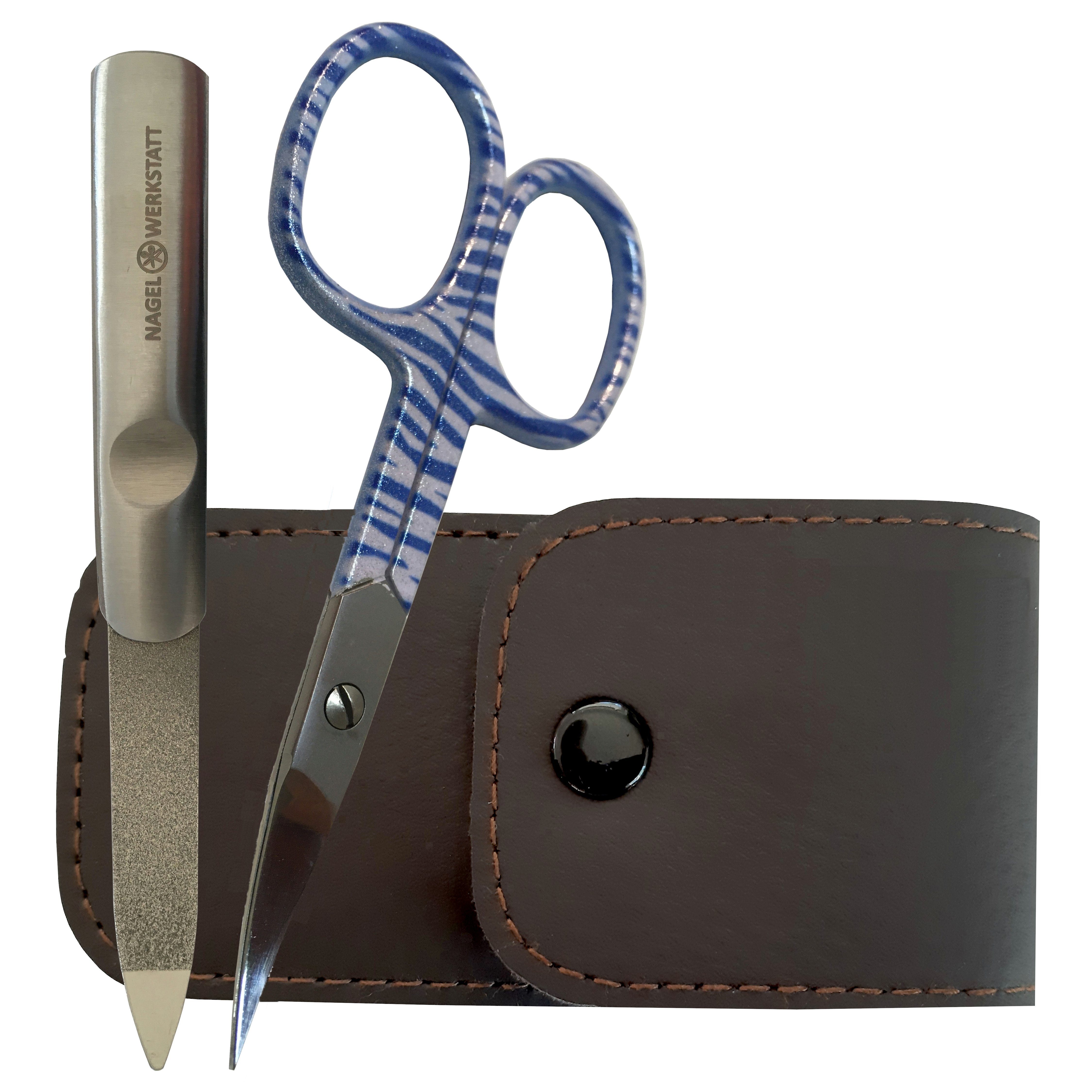 Lieferumfang | 1x Nagelwerkstatt Nagelschere - 1x Nagelfeile - 1x Etui aus Kunstleder |