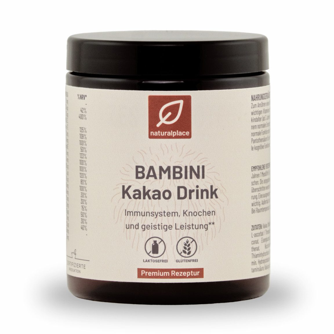 Wohlschmeckender Kakao-Drink für Kinder ab dem Kindergartenalter, der eine sinnvolle Kombination aus wertvollen Vitaminen, Spurenelementen, Mineralstoffen und hochwertigem Vitalpilz-Extrakt aus Hericium bietet. Vitamin D (Cholecalciferol - 800 I.E.) ist entscheidend für die Aufrechterhaltung einer normalen Funktion des Immunsystems, der Knochen und Muskeln, da es bei der Aufnahme und Verwertung von Calcium hilft und zum normalen Calciumspiegel im Blut beiträgt. Beta-Carotin als Vitamin-A-Quelle, Vitamin B6, das schnell absorbierbare Vitamin C Ester-C® sowie die Mineralstoffe Zink in Form des hoch bioverfügbaren Zinkgluconats und Selen tragen zu einer normalen Funktion des Immunsystems bei. Auch Folsäure, Eisen und Vitamin B12 (in Form der erprobten MHA-Formel) leisten einen wertvollen Beitrag für das Immunsystem und fördern zusammen mit Calcium die Zellteilung. Die MHA-Formel für Vitamin B12 besteht aus drei hoch bioverfügbaren, aktiv aufeinander abgestimmten Formen des Vitamins, die alle als Speicherformen fungieren. Pantothensäure trägt zur geistigen Leistungsfähigkeit bei, während die Vitamine B1 (Thiamin), B2 (Riboflavin), B6 (Pyridoxin), B12 (Cobalamin), Niacin und Biotin den Energiestoffwechsel und die Nervenfunktion unterstützen. Jod fördert das normale Wachstum von Kindern und, wie auch Zink und Eisen, unterstützt es die normalen kognitiven Funktionen. Dies umfasst vor allem Denkprozesse, Lernfähigkeit, Wahrnehmung und Aufmerksamkeit. Der schmackhafte Kakao-Drink wird mit hochwertigem Hericium-Extrakt verfeinert. Hericium ruft „Ich mache fröhlich!“ zu und wird wegen seiner harmonisierenden Eigenschaften geschätzt. Darüber hinaus weist der Vitalpilz alle essentiellen Aminosäuren sowie zahlreiche weitere wertvolle Inhaltsstoffe auf. Unser Hericium-Extrakt weist einen Standard von 30 % Polysacchariden und 20 % Beta-Glucanen auf. Tipp: Der BAMBINI Kakako Drink eignet sich auch hervorragend zum Einrühren in Müsli oder Pudding.
