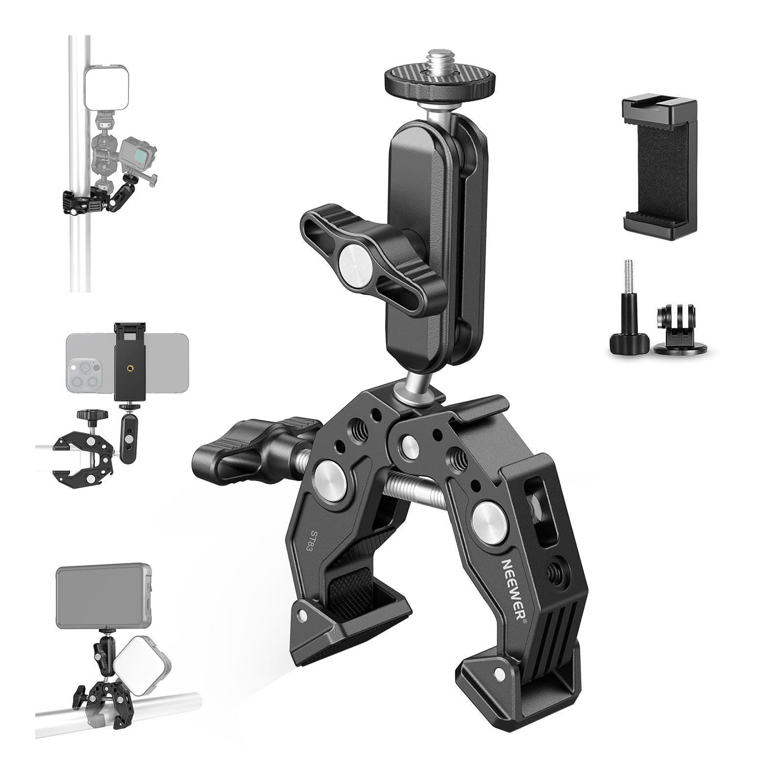 Lieferumfang | 1 x Superklemme mit Magischen Arm 1 x Action Kamera Montageadapter 1 x Telefonhalter 1 x abnehmbarer Zubehörschuh Montageadapter 1 x Benutzerhandbuch |