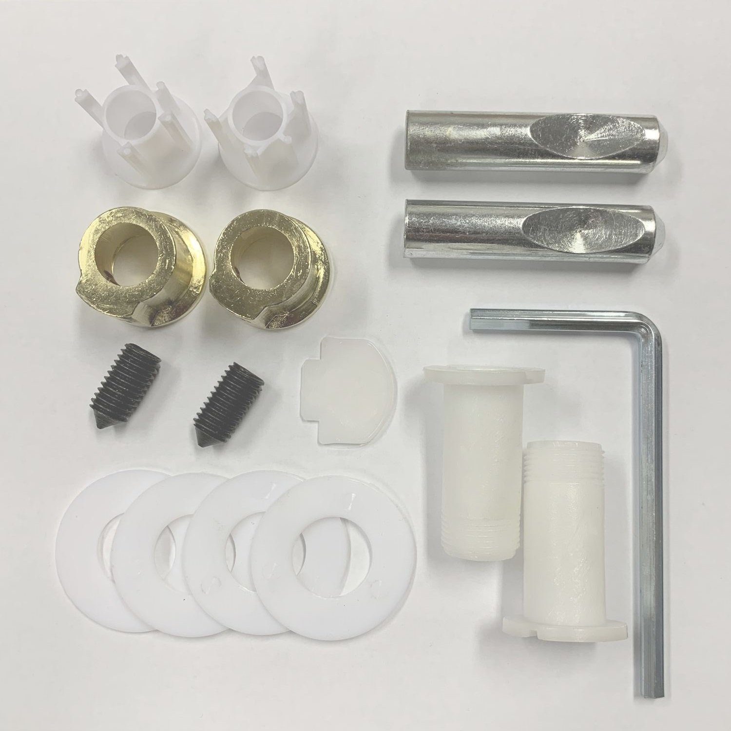 Die Verschraubung erfolgt von oben durch die Löcher der Deckelbefestigung mittels zweier Bolzen, welche auf die Gewindestangen aufgesetzt werden. Die von eben eingesetzte Madenschraube 'greift' in der Vertiefung dieses Bolzens und fixiert das WC. Ideal ist dies auch, wenn die Gewindestangen zu kurz geraten sind und somit keine 'alte' Montage-Art mehr möglich ist.