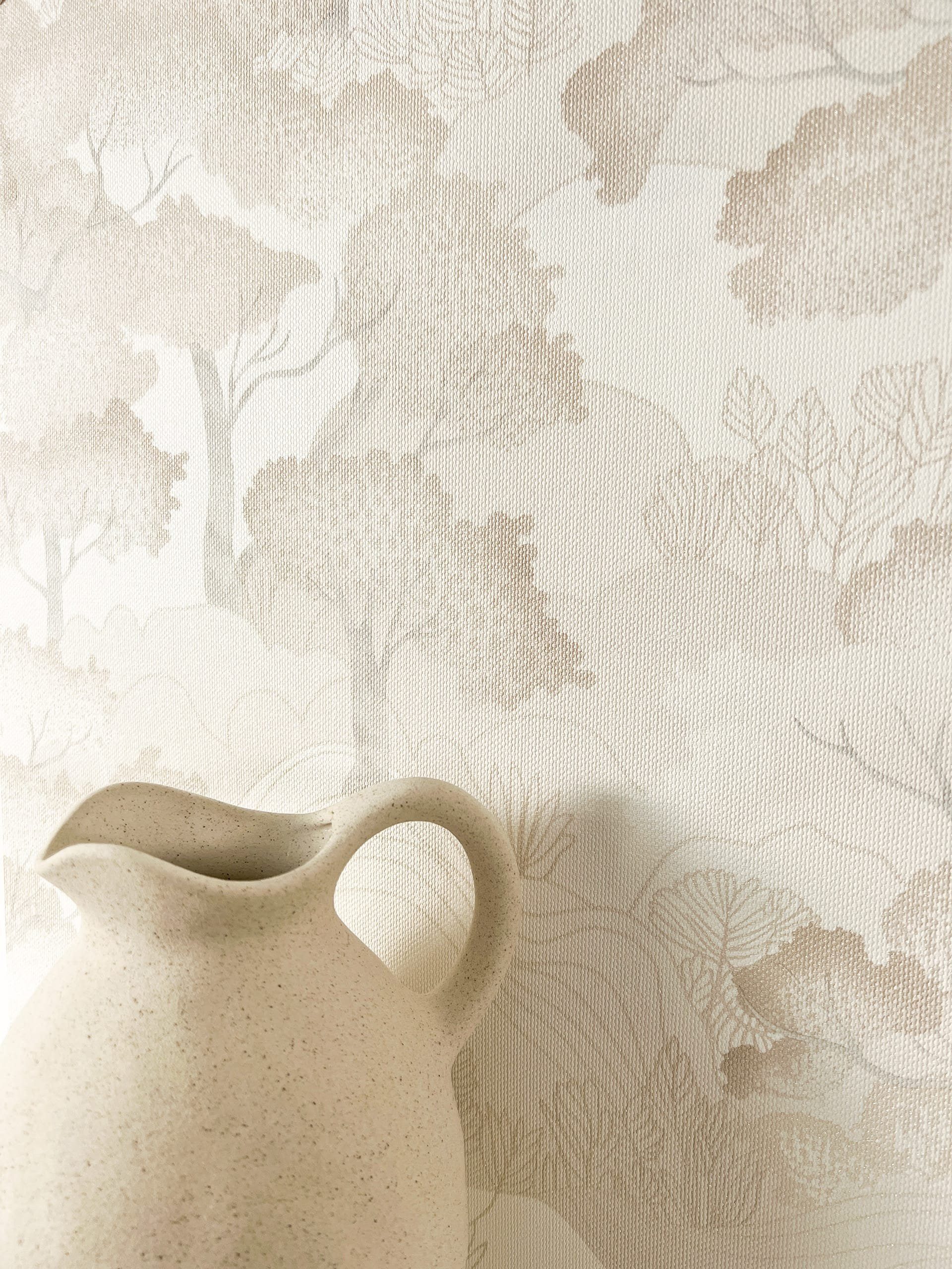 Oberflächenstruktur | Creme Tapete Modern Bäume - Mustertapete Botanisch Beige Weiß Asiatisch Grafisch Blätter Wolken für Wohnzimmer Schlafzimmer Küche |
