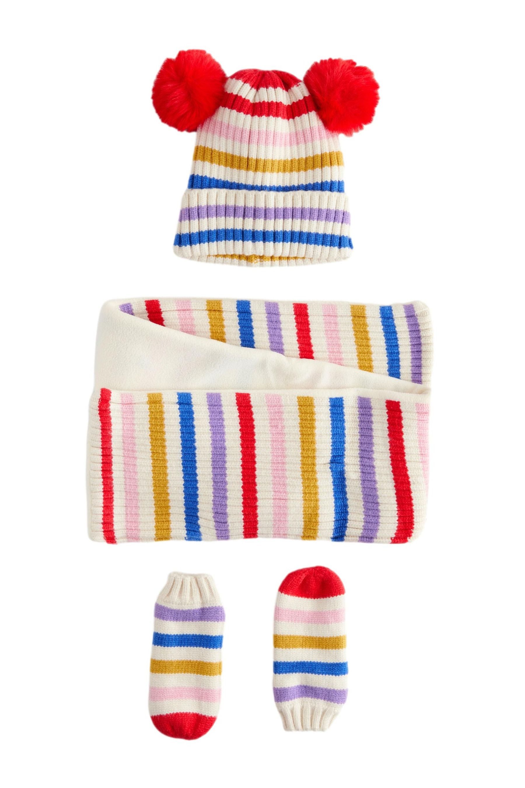 Materialzusammensetzung | Mütze, Hauptmaterial: 50 % Viskose, 30 % Polyester, 20 % Polyamid. Besatz: 100 % Polyester. Schal, Hauptmaterial: 50 % Viskose, 30 % Polyester, 20 % Polyamid. Futter: 100 % Polyester. Handschuhe: 50 % Viskose, 30 % Polyester, 20 % Polyamid. |