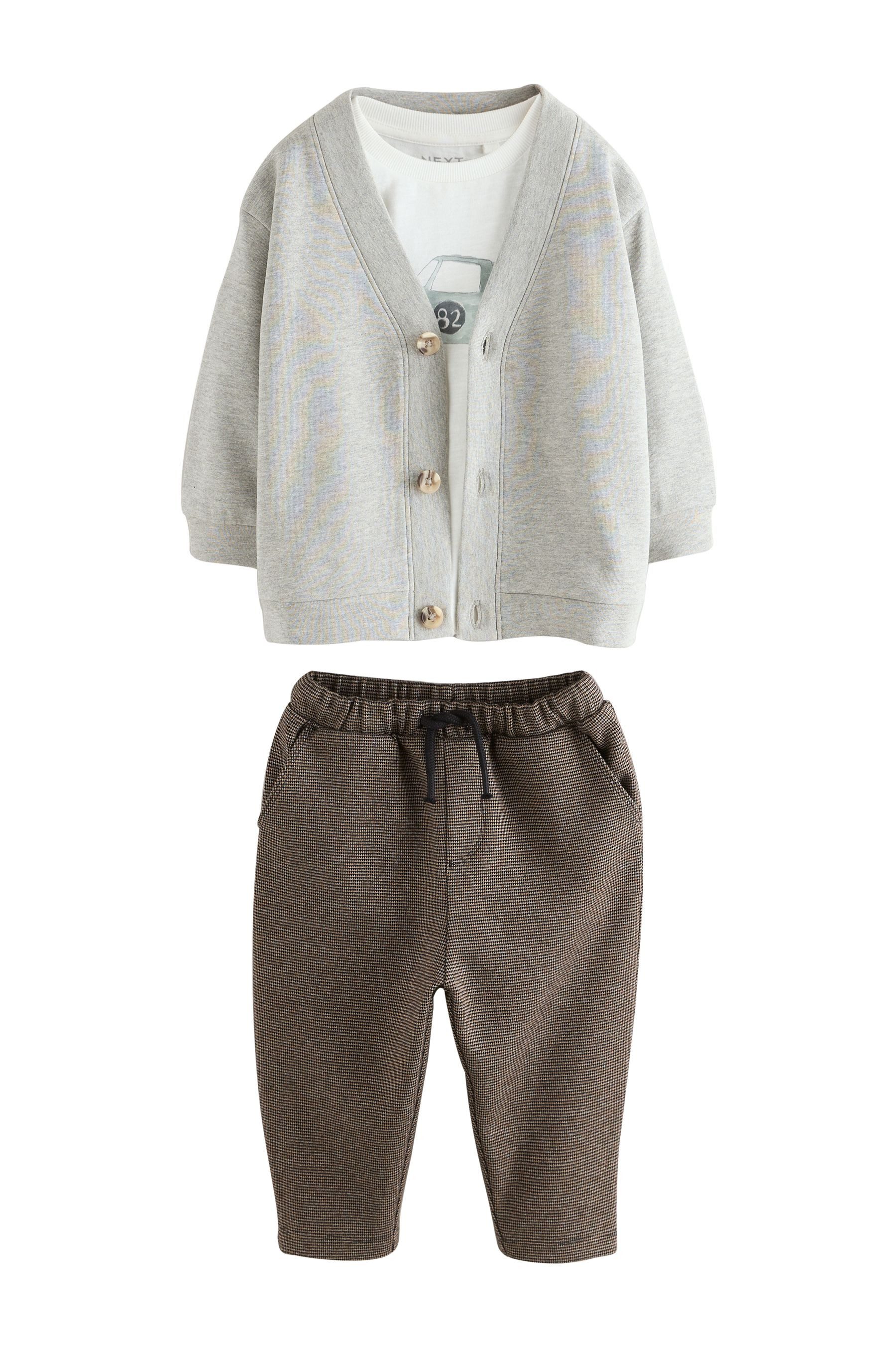Materialzusammensetzung | Strickjacke: 93 % Baumwolle, 7 % Viskose. T-Shirt: 100 % Baumwolle. Jogginghose: 68 % Baumwolle, 27 % Polyester (recycelt), 5 % Elasthan. |