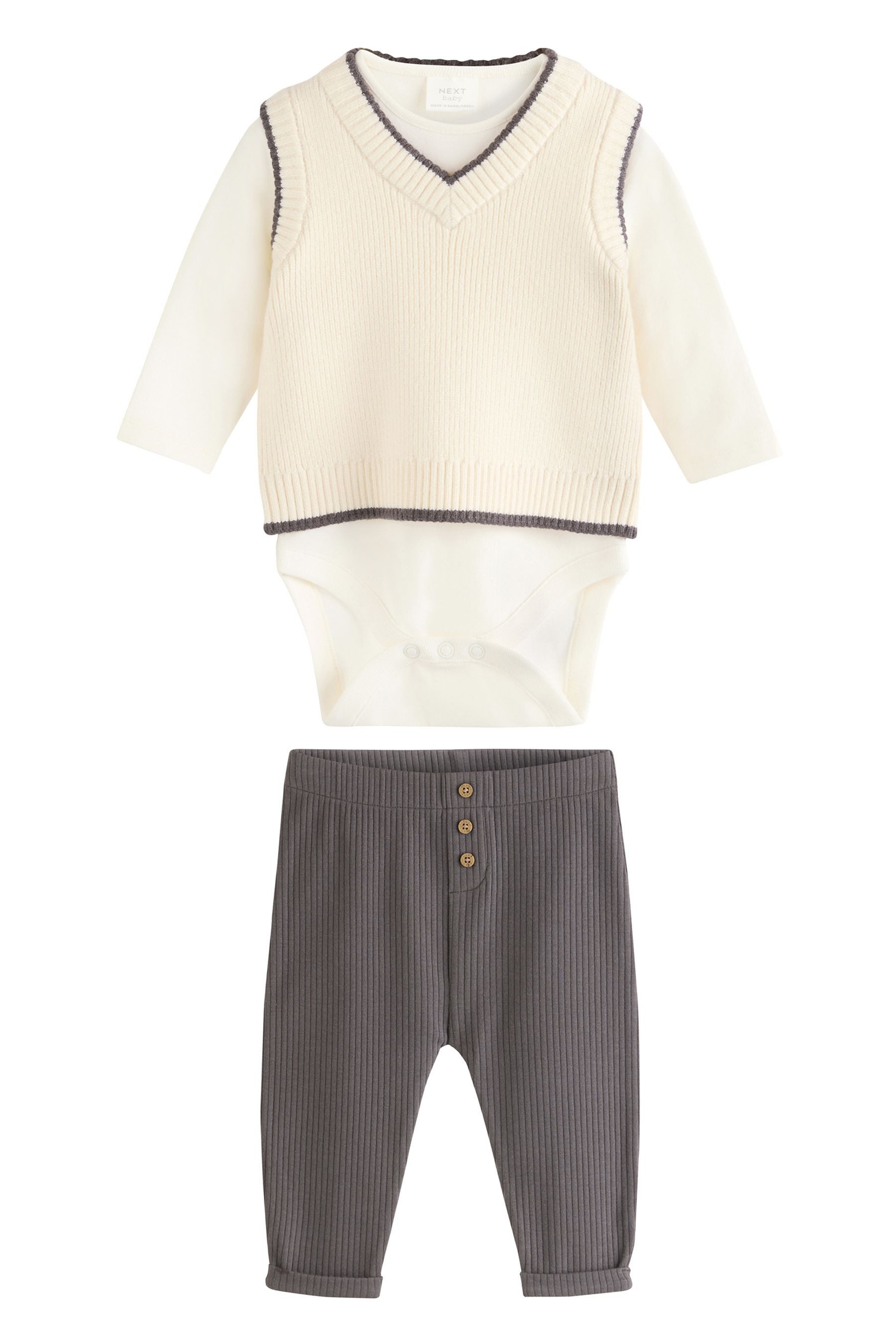 Materialzusammensetzung | Bodysuit: 92 % Baumwolle, 8 % Elasthan. Trägertop: 55 % Viskose, 28 % Polyester, 17 % Polyamid. Leggings: 95 % Baumwolle, 5 % Elasthan. |
