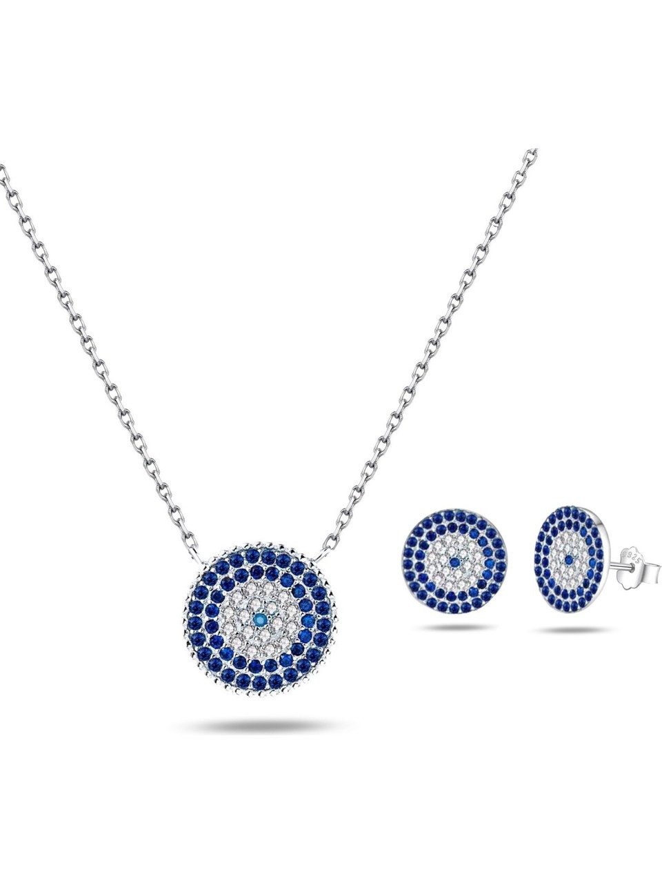 Dieses elegante Schmuckset, bestehend aus einer Halskette und passenden Ohrsteckern, ist vom traditionellen Schutzsymbol „Nazar Boncuk“ inspiriert und verbindet kulturelle Bedeutung mit moderner Eleganz. Gefertigt aus hochwertigem 925er Sterling Silber, präsentiert sich das Set in einem filigranen, kreisförmigen Design mit fünf präzise gesetzten Reihen funkelnder blauer und klarer Zirkonia-Steine.