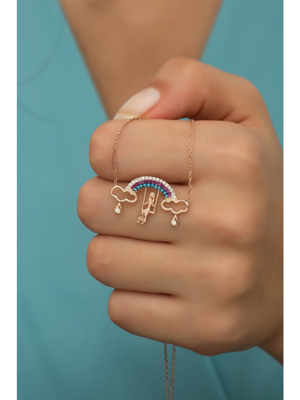 Diese filigrane Damenhalskette aus 925 Sterling Silber vereint verspieltes Design und hochwertige Verarbeitung. Der Anhänger zeigt ein einzigartiges Regenbogen-Motiv mit einer Frau auf einer Schaukel zwischen zwei Wolken. Funkelnde bunte Zirkonia-Steine verleihen dem Regenbogen strahlende Farben, während die Roségold-Beschichtung für einen modernen und eleganten Look sorgt. Mit ihrer Symbolik für Freude, Freiheit und Leichtigkeit ist diese Halskette ein besonderer Blickfang – ideal für Frauen, die farbenfrohen Schmuck lieben.