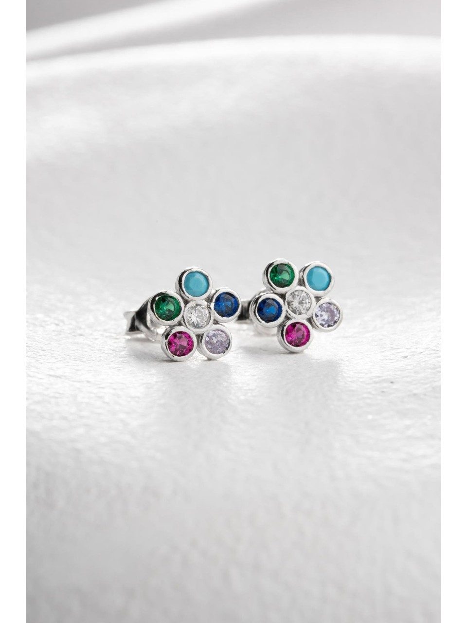 Verspieltes Blumen-Design mit funkelnden Zirkonia-Steinen in verschiedenen Farben für einen frischen, jugendlichen Look.