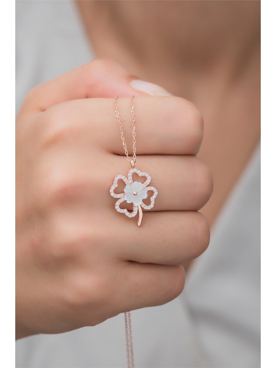 Diese elegante Halskette aus echtem 925 Sterling Silber vereint Symbolik und feine Handarbeit. Der Anhänger zeigt ein vierblättriges Kleeblatt, das als Glückssymbol bekannt ist, verziert mit funkelnden Zirkonia-Steinen und einer filigranen Magnolienblüte in der Mitte. Mit einer Розмір von ca. 1,80 x 2,00 cm und einem Gewicht von etwa 2,90 g wirkt der Anhänger auffällig, ohne zu schwer zu sein. Die 42 cm lange Kette legt sich sanft um den Hals, während die edle Rosévergoldung dem Schmuckstück einen modernen, femininen Glanz verleiht. Geliefert wird die Kette in einer stilvollen Geschenkbox – ideal als besonderes Präsent oder als Glücksbringer für den eigenen Alltag.