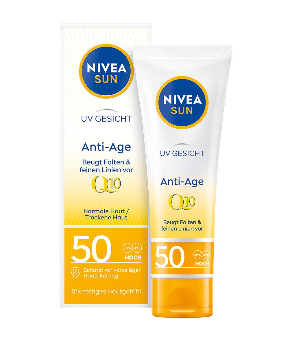 Der NIVEA SUN Anti-Age Ultra-Spektrum Sonnenschutz LSF 50 mit Q10 schützt die Haut von AUßEN vor UVA/UVB-Strahlen und vor den Auswirkungen von blauem Licht, wie z. B. vorzeitiger Hautalterung. Zusätzlich schützt er die Haut von INNEN durch ein starkes natürliches Antioxidans, das die hauteigenen Abwehrmechanismen aktiviert. Die feuchtigkeitsspendende Formel mit Q10 beugt Fältchen und vorzeitiger Hautalterung vor. Zusätzlich sorgt sie für ein seidig-weiches Hautgefühl, ideal für den täglichen Gebrauch. Augenfreundliche Formel – augenärztlich bestätigt. Die neue und verbesserte Formel ist bis zu 68 % biologisch abbaubar, frei von den UV-Фільтри Octinoxate, Oxybenzone, Octocrylene und frei von Mikroplastik. Der perfekte Anti-Aging Sonnenschutz für Gesicht, Hals und Dekolleté: NIVEA SUN Anti-Aging Sonnencreme Q10 LSF 50.