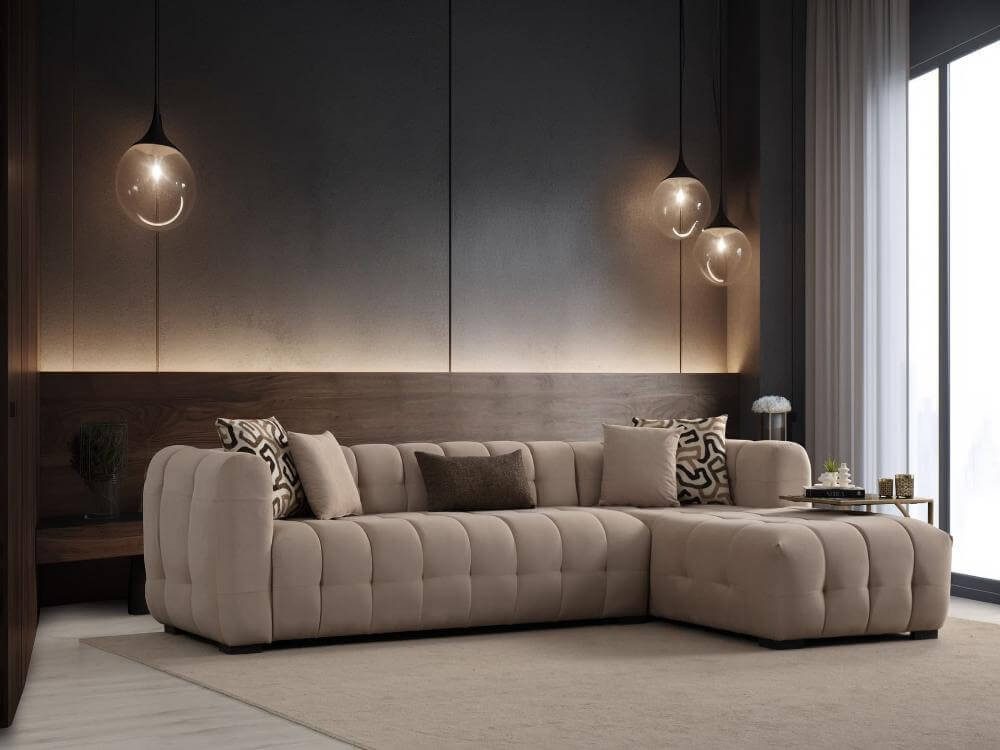 Verleihen Sie Ihrem Wohnzimmer einen Hauch von Eleganz und Gemütlichkeit mit dem Ecksofa "Jacaranda". Dieses in Beige gehaltene Sofa vereint klassisches Design mit modernen Komfortmerkmalen, um Ihren Wohnraum stilvoll aufzuwerten.
