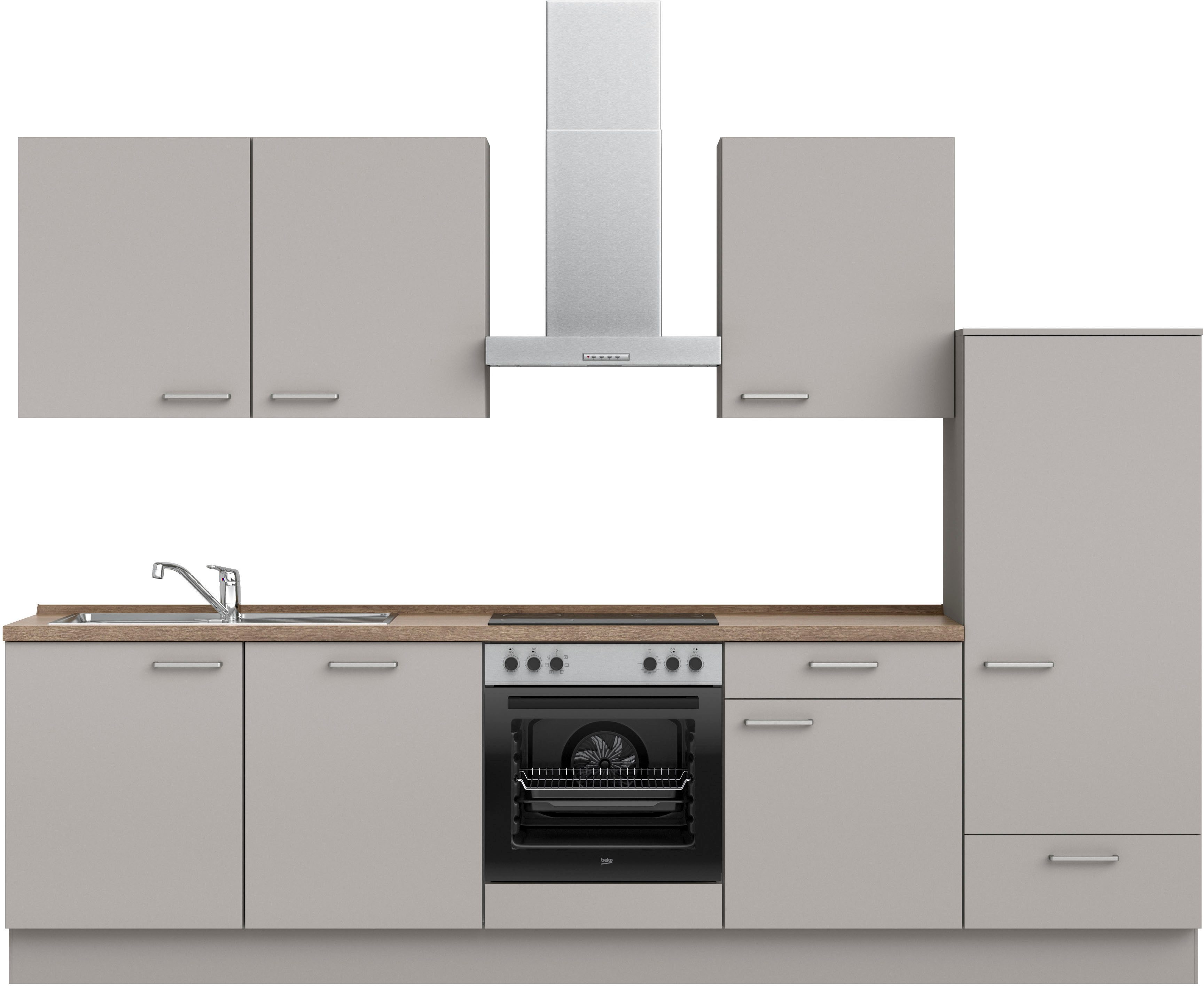 Ausstattung | Durchgehende Arbeitsplatte Einlegeböden höhenverstellbar Metallgriffe Schubkästen mit Soft-Close-Funktion Türen mit Soft-Close-Funktion Wandabschlussleiste |
