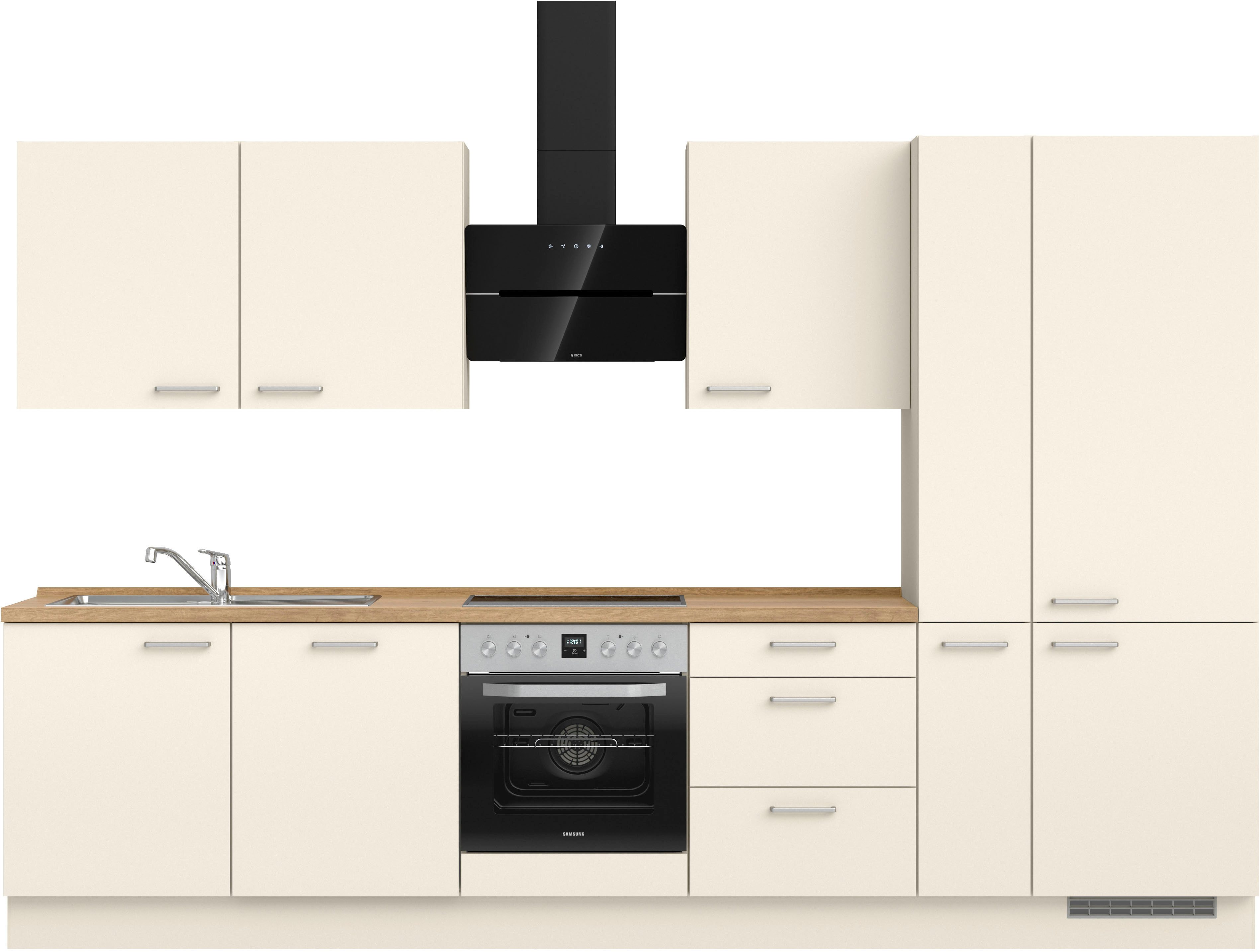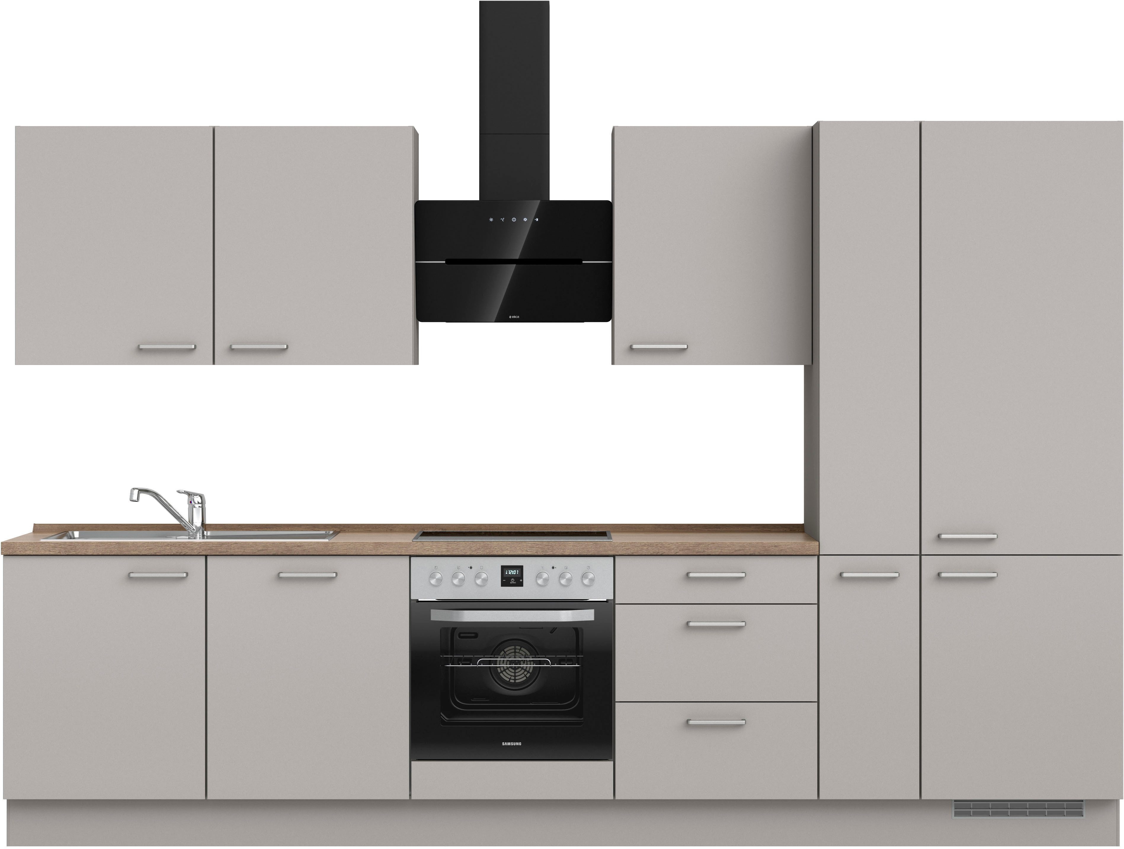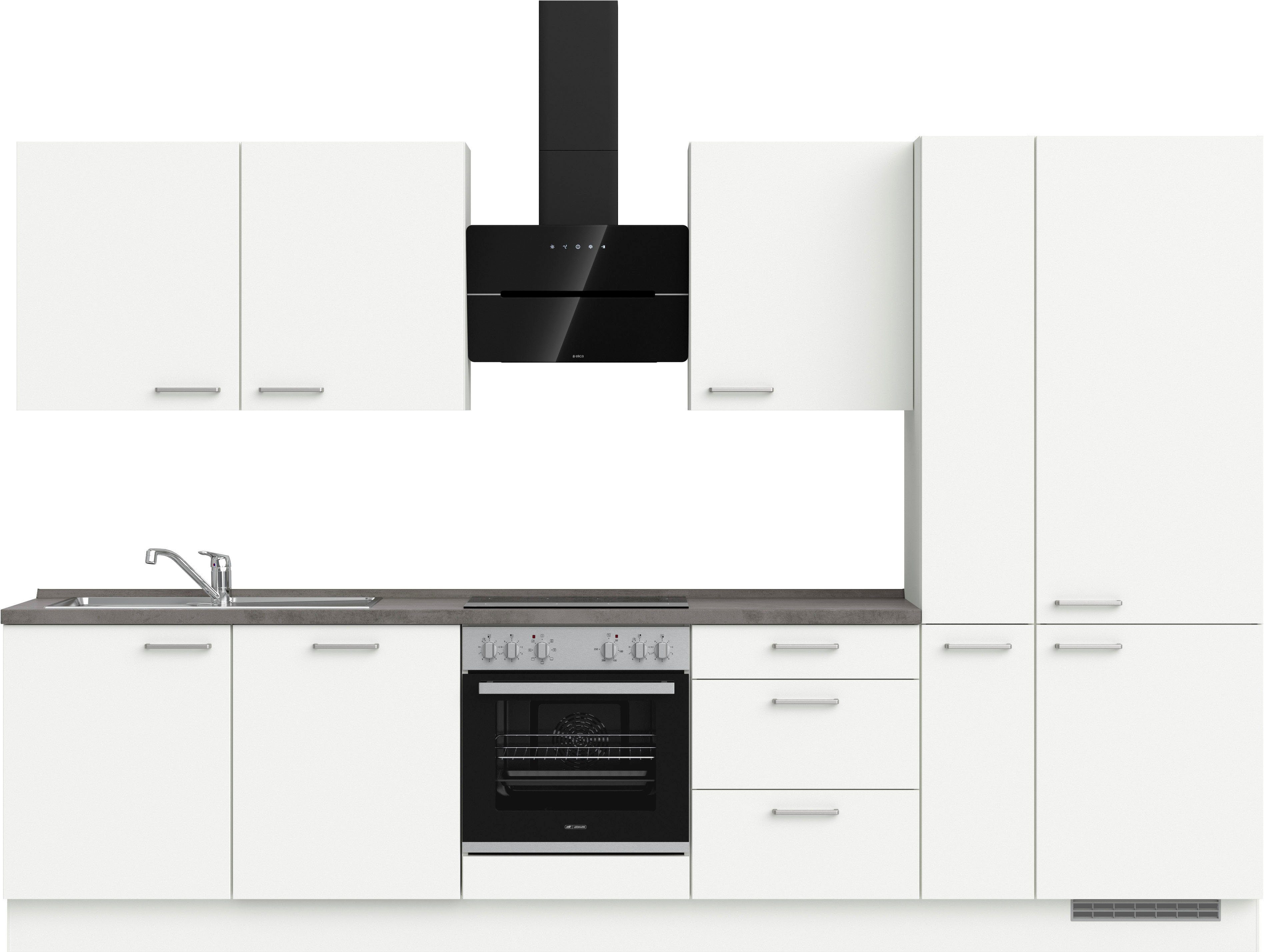 Ausstattung | Durchgehende Arbeitsplatte Einlegeböden höhenverstellbar Metallgriffe Schubkästen mit Soft-Close-Funktion Türen mit Soft-Close-Funktion Wandabschlussleiste |