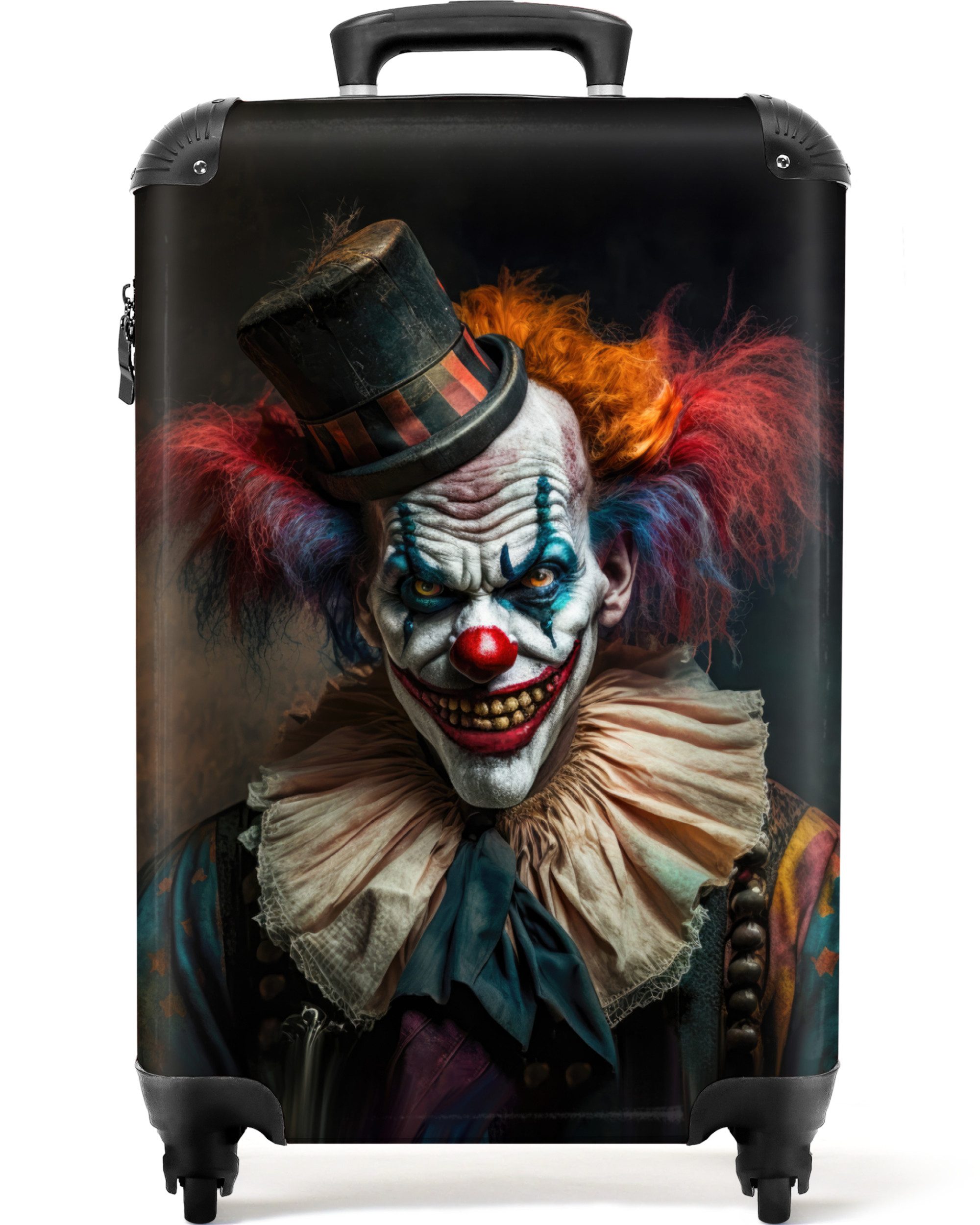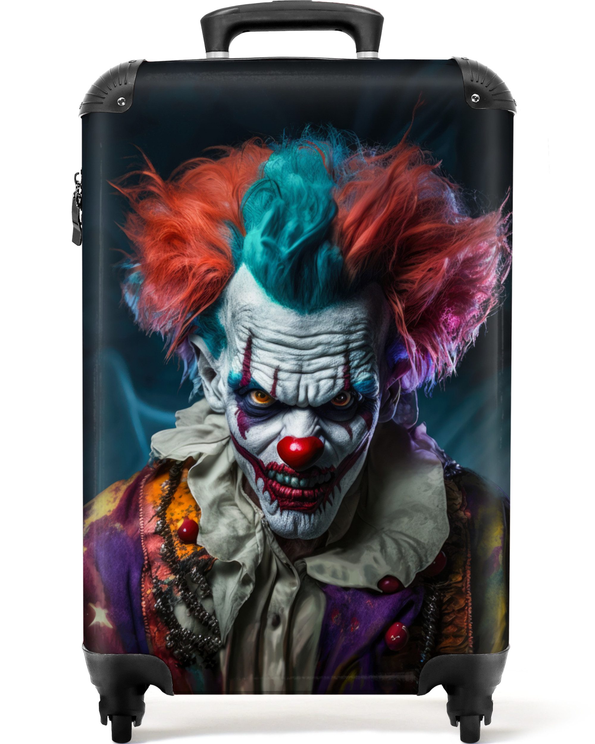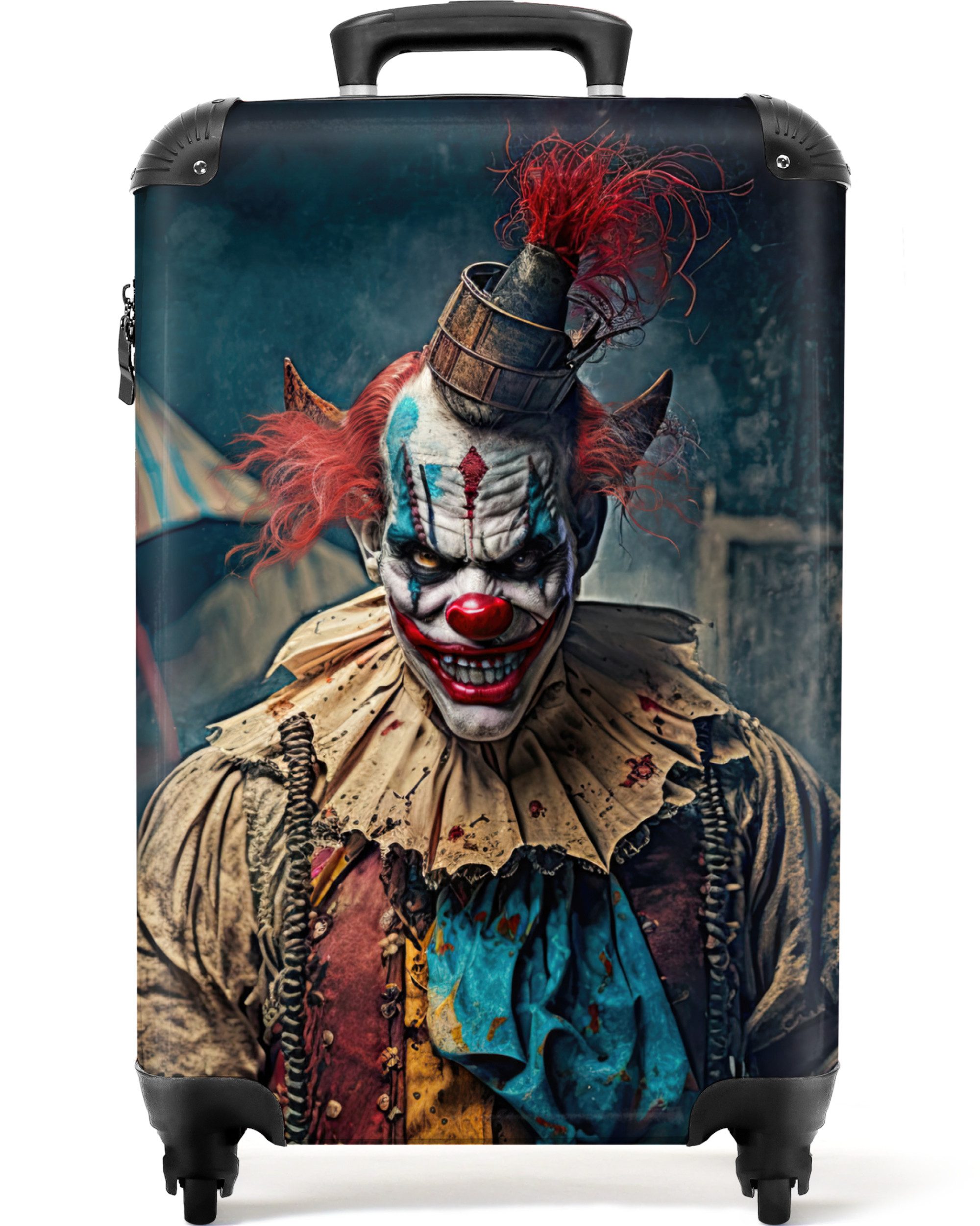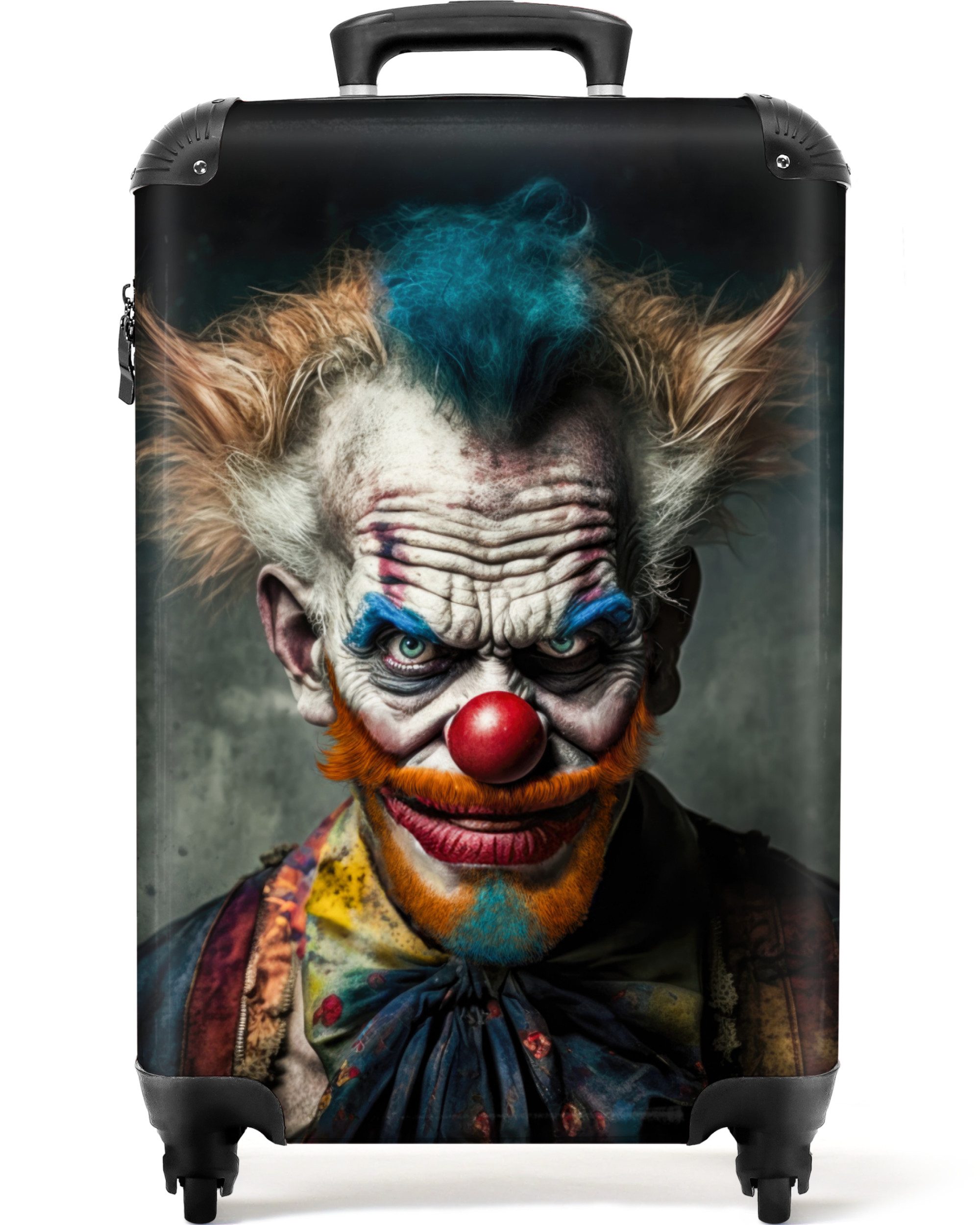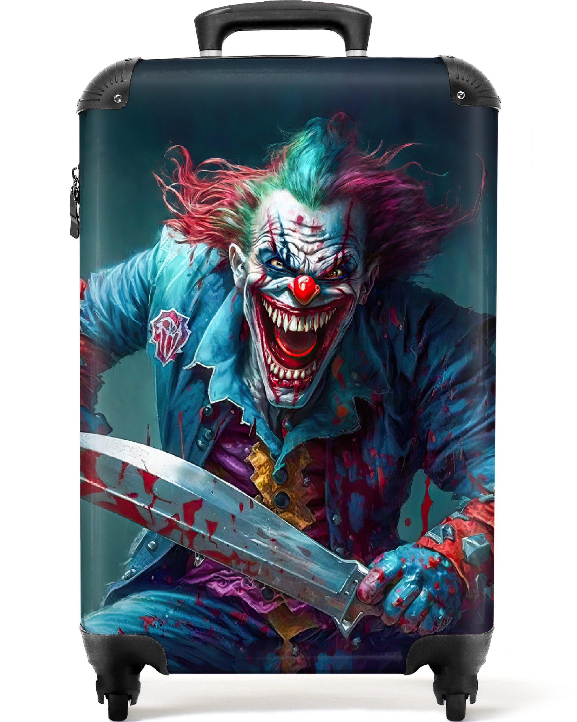 Sie suchen nach einem weiteren einzigartigen Koffer für den Urlaub? Dann könnte dieser Koffer von NoBoringSuitcases genau das Richtige für Sie sein! Auf dem Koffer ist das Porträt eines Killerclowns mit einem Messer abgebildet.