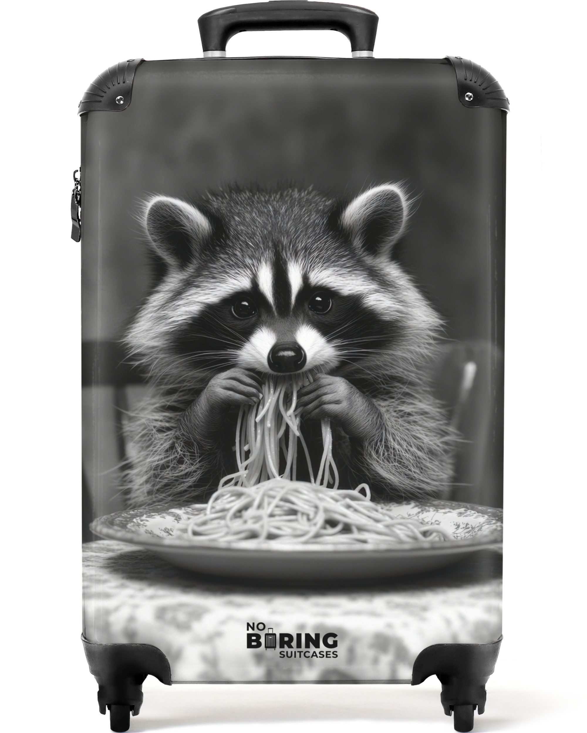 Ein Schwarz-Weiß-Bild eines Waschbären, der mit beiden Pfoten Spaghetti zum Mund führt und an einem runden Tisch mit gedecktem Tischtuch sitzt.Optik | bedruckt |