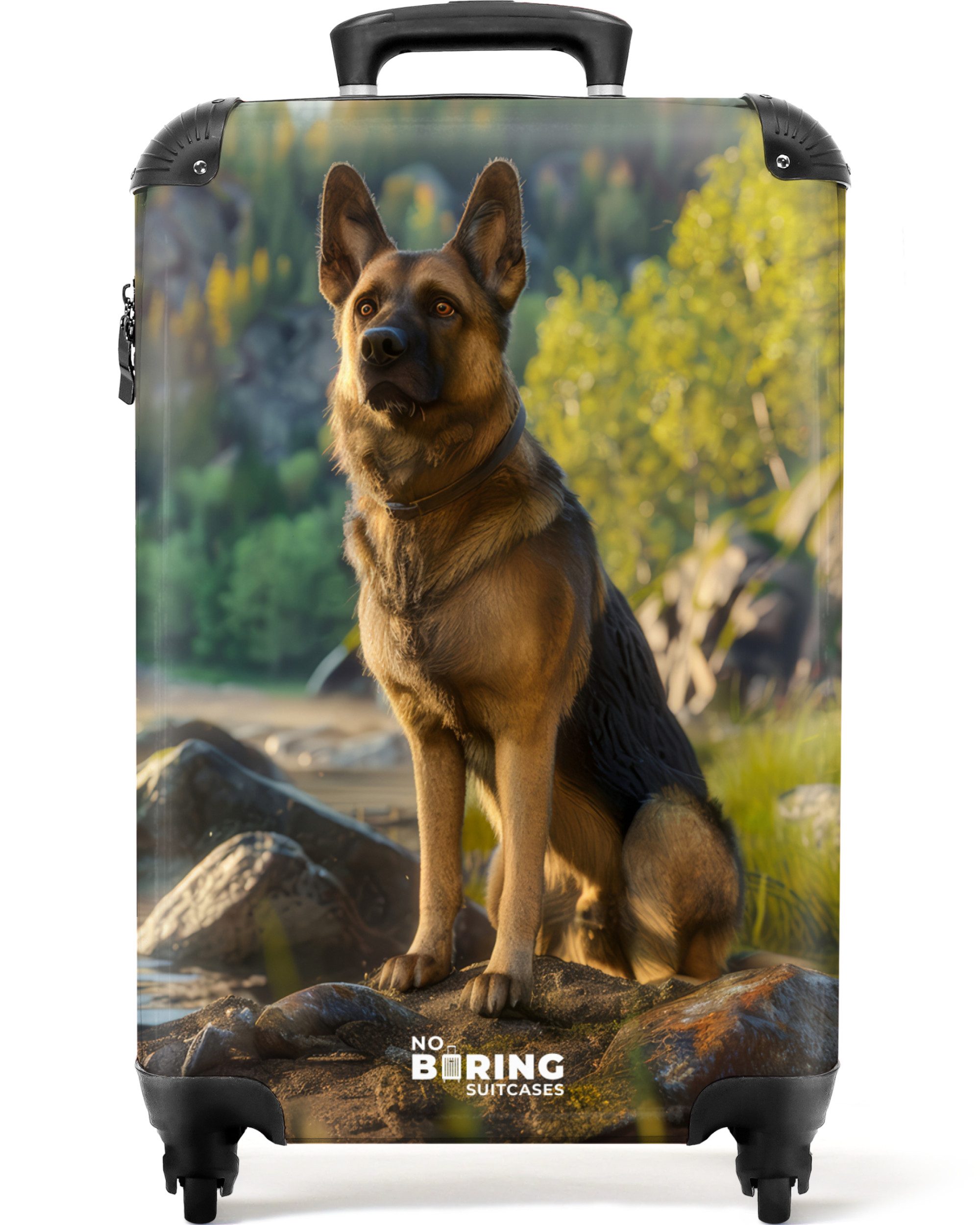 Ein Deutscher Schäferhund sitzt stolz auf einem Felsen in einem bewaldeten Gebiet, umgeben von üppigem Grün und einem ruhigen Fluss. Das Bild strahlt Stärke und Wachsamkeit aus, ideal für Hunde- und Naturliebhaber.Optik | bedruckt |