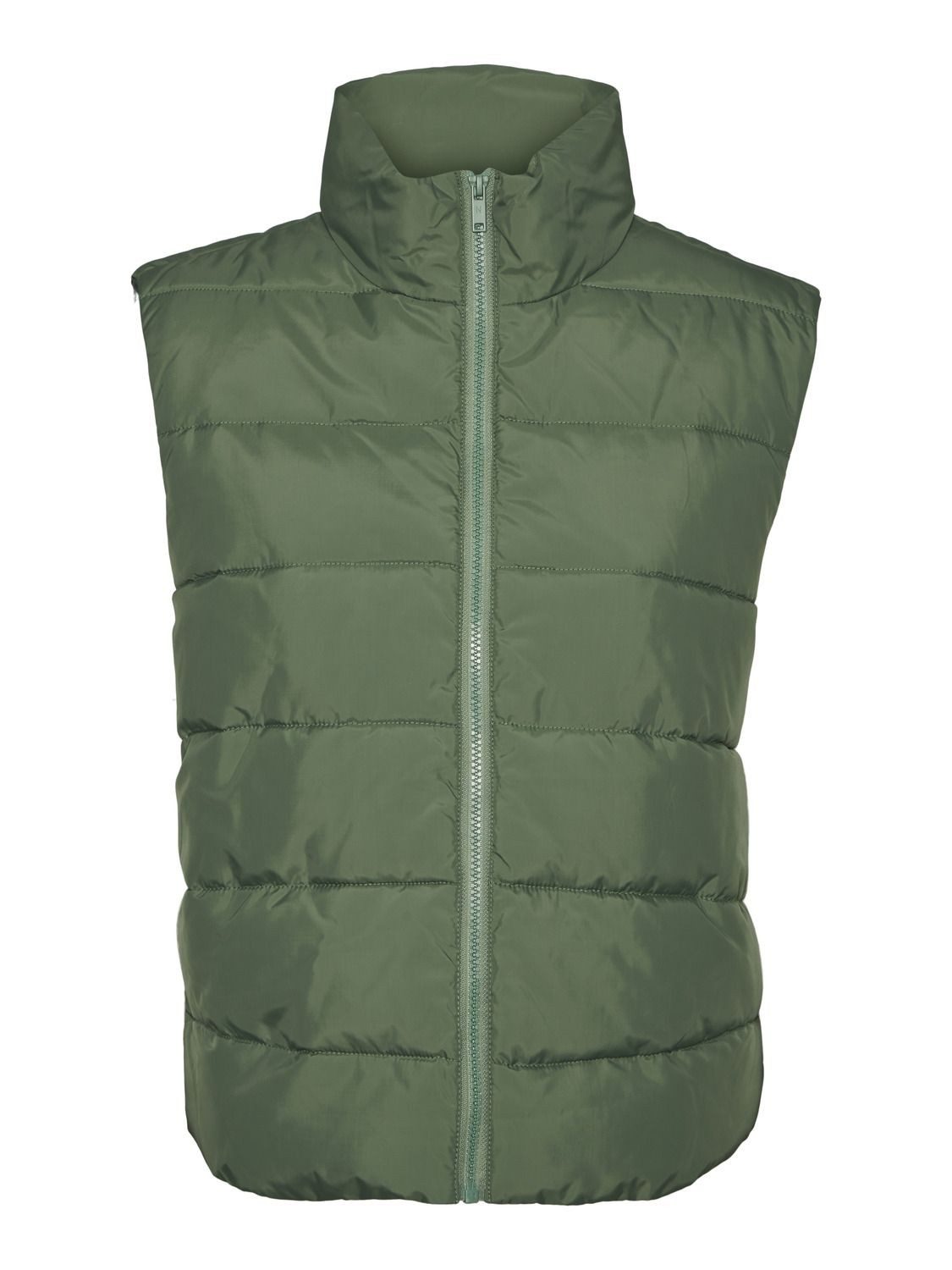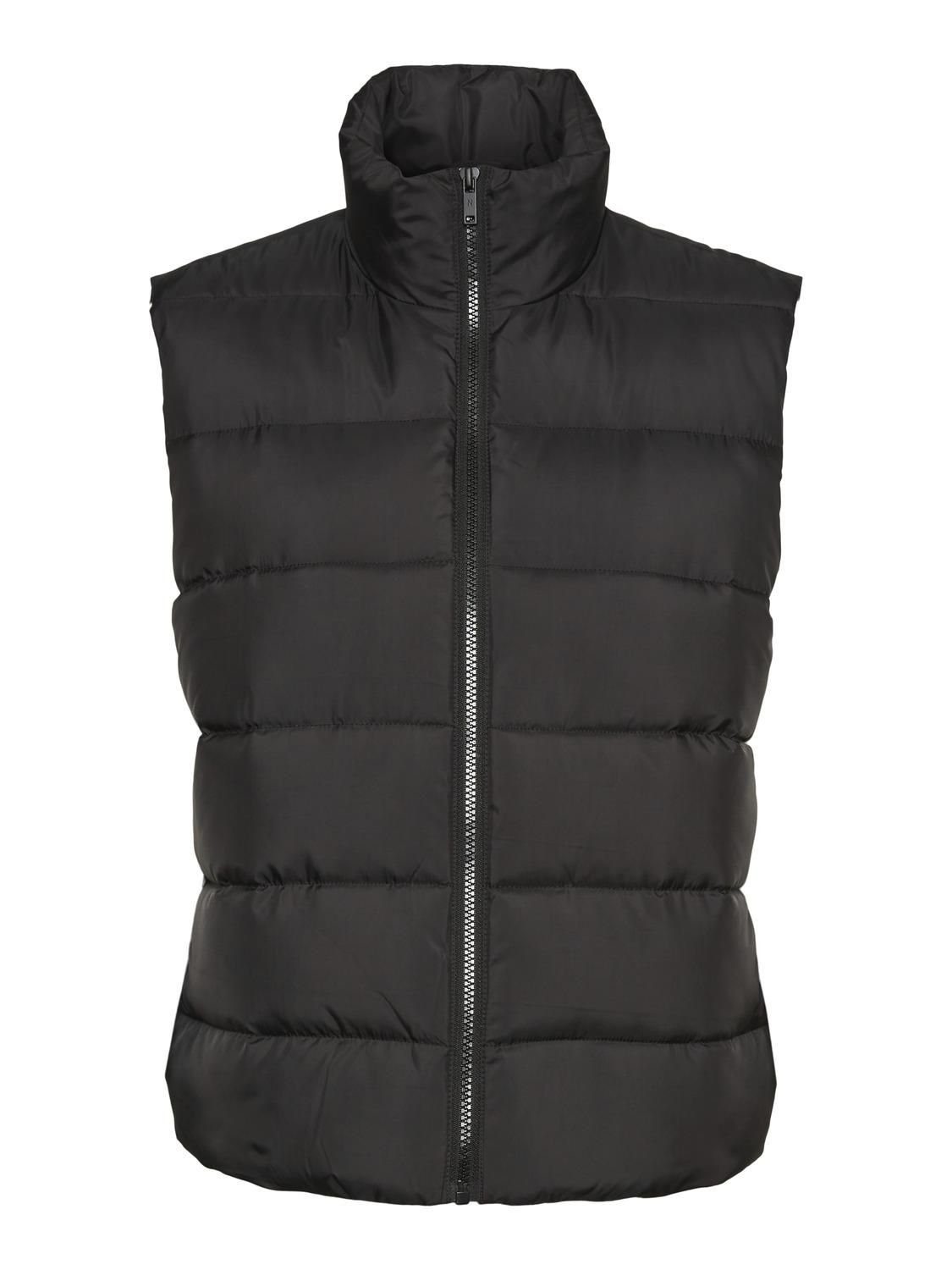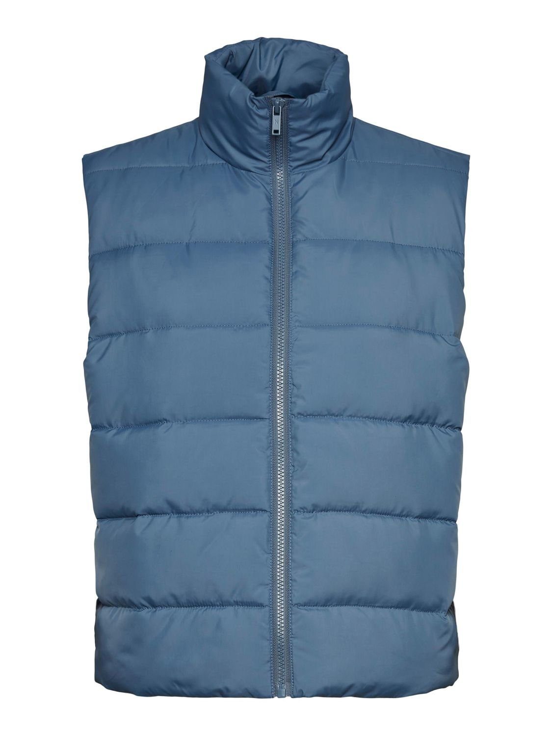 Durchgehender Reißverschluss, 2 offene Fronttaschen und Stehkragen vervollständigen die Weste.