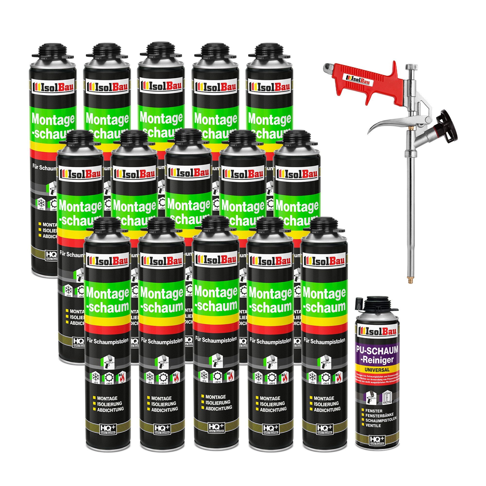 IsolBau Montageschaum ist ein einkomponentiger, feuchtigkeitshärtender, selbstexpandierender und gebrauchsfertiger Polyurethanschaum zum professionellen Montieren, Abdichten, Kleben, Füllen von Spalten, Hohlräumen, Fugen und zur professionellen Schalldämmung. Der Schaum haftet sehr gut auf allen Untergründen. Ideal zum professionellen Abdichten und Montieren von Türen, Fenstern, Brüstungen, Treppenstufen, Trennwänden und vielen anderen Bauarbeiten. Der Pistolenschaum wird mittels einer handelsüblichen Montagepistole ausgesprüht. Dadurch ist eine sehr hohe Formstabilität mit exzellenter Ausbeute und Schaumstruktur erzielbar. IsolBau Montageschaum ist Alterungs- und verrottungsbeständig, resistent gegen Chemikalien und Ungeziefer. Das Treibgas ist für die Ozonschicht unschädlich.