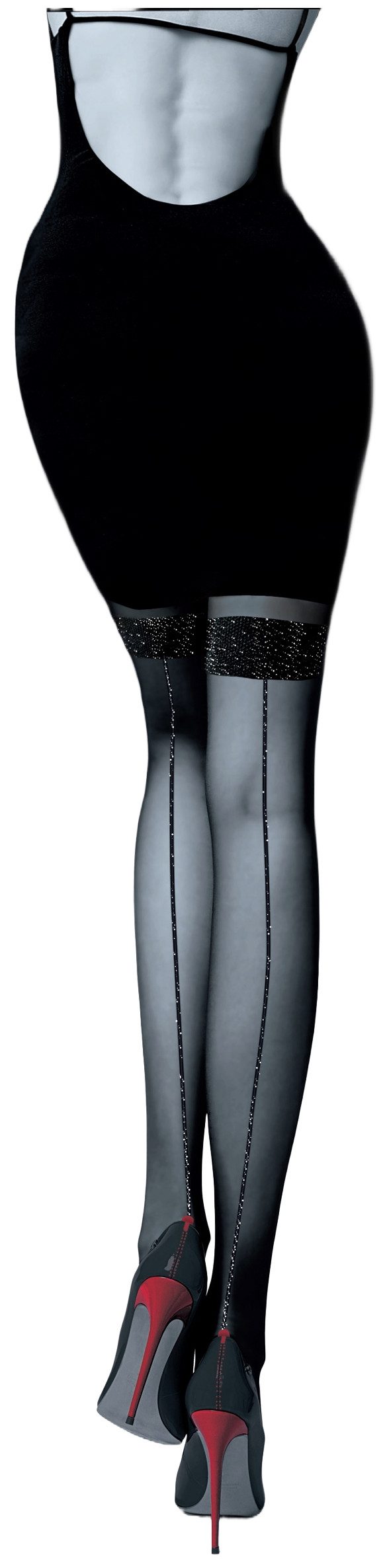 Diese transparente Strumpfhose ist ein glamouröses Modeaccessoire, das durch die Imitation von Strümpfen mit einer glänzenden Naht und einem verzierten Bündchen beeindruckt. Ein absolutes Must-have für jede Frau, die auf stilvolle Weise Akzente setzen möchte. Diese Strumpfhosen in klassischem Schwarz eignen sich perfekt als Ergänzung zu einem kurzen Kleid und High Heels. Durch die geschickte Imitation von Strümpfen wirken die Beine optisch schlanker und länger. Sie sind die ideale Wahl für Abende, Partys und Bälle, bei denen Sie mit einem Hauch von Glamour und Sinnlichkeit punkten möchten.