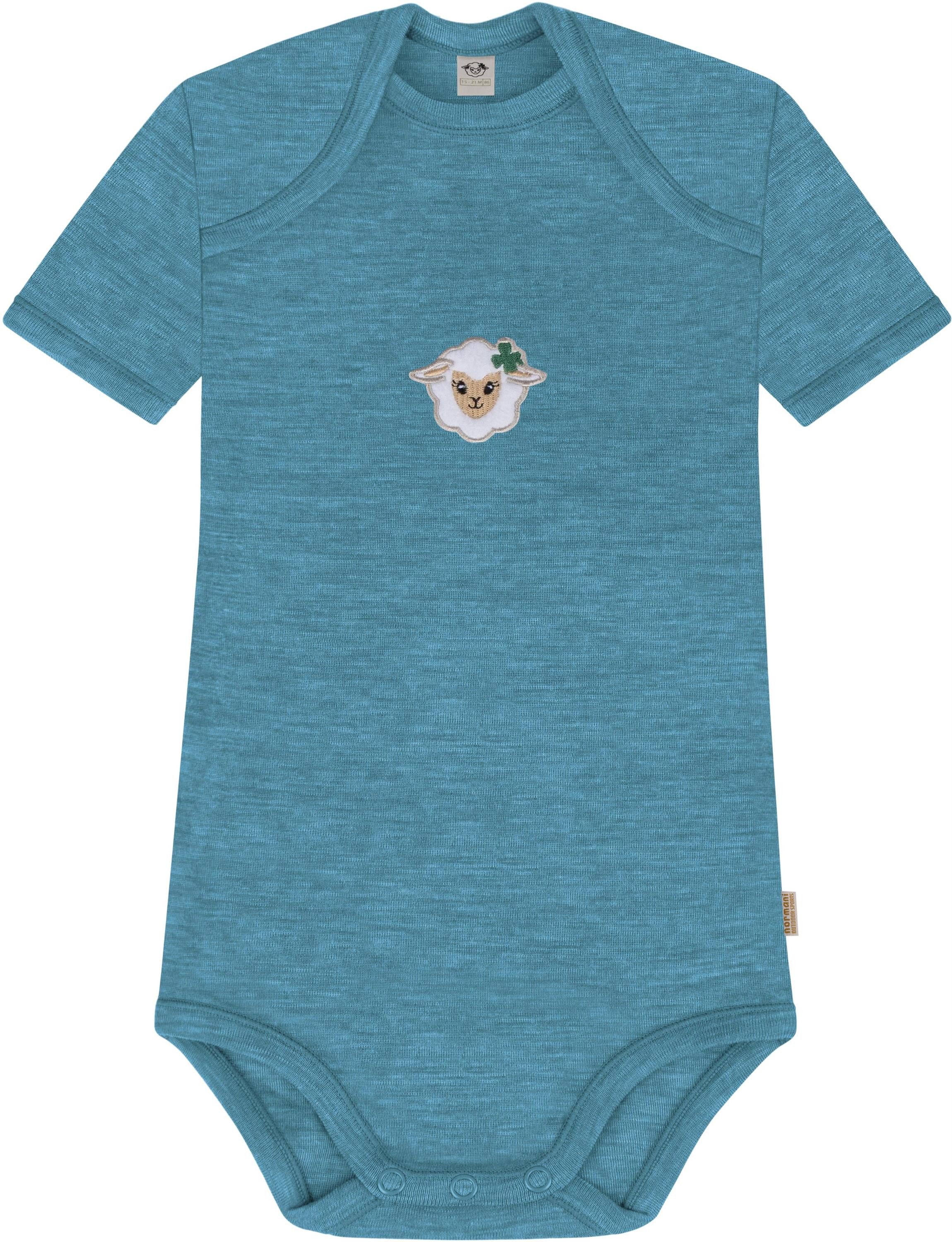 Unser Merino Kurzarm Body "Tauranga" ist mehr als nur ein einfacher Baby Body mit kurzen Ärmeln und amerikanischem Ausschnitt. Hinter seiner schlichten Erscheinung verbirgt sich ein Kleidungsstück, das sich perfekt für alle Wetterbedingungen eignet. Mit einer Grammatur von 200 g/m² bietet dieser Body eine optimale Wärmeisolierung, die ihn im Winter zur idealen wärmenden Schicht unter weiterer Kleidung macht. Auch im Sommer kann der Body wegen seiner natürlichen Thermoregulierung einzeln getragen werden. Die Wärmeregulierung und Atmungsaktivität der Merinowolle ermöglichen es Ihrem Baby, den Body den ganzen Tag über zu tragen – sei es beim Spielen oder beim Nickerchen. Die weiche Merinowolle ist besonders sanft zur empfindlichen Haut Ihres Babys und verursacht keine Hautirritationen. Zudem ist die Merinofaser geruchsneutralisierend, sodass der Body auch nach mehrmaligem Tragen frisch bleibt. Die Elastizität der Merinowolle und der amerikanische Ausschnitt sorgen für maximale Bewegungsfreiheit beim Spielen und Umziehen. Впередhin ist der Body mit Marken-Druckknöpfen von YKK zwischen den Beinen ausgestattet. Diese ermöglichen ein zuverlässiges Öffnen und Сховати und erleichtern das Wickeln. Abgerundet wurde der Body mit einem kindgerechtem, flauschigem Schaf Stick, der als Eyecatcher dient.