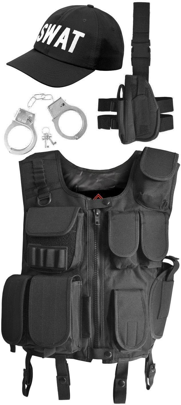 Mit diesem SWAT Kostüm sind Sie auf jeder Kostümparty ein Blickfang! Das Kostüm besteht aus einer qualitativ hochwertigen Weste mit integriertem Pistolenholster und zusätzlich noch ein separates Pistolenbeinholster. Zudem im Set enthalten ist ein Klett Patch mit der Aufschrift „SWAT“, eine verstellbare Cap - ebenfalls mit Schriftzug, sowie Handschellen mit Schlüssel.