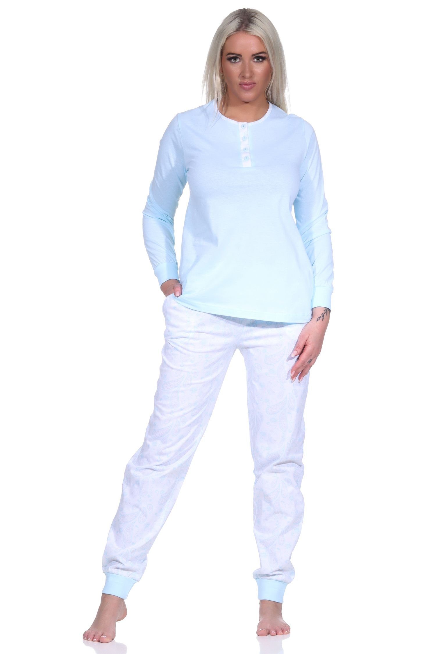 Immer Entspannt, egal ob am Tag oder in der Nacht, dafür ist dieser Schlafanzug ideal! Mit diesem gemütlichen langarm Damen Pyjama von Normann sind Sie immer gut angezogen. Die Hose des Damen Schlafanzugs hat ein elegantes Paisley Motiv als Allover Druck, das Oberteil von diesem Damen Pyjama lang ist unifarben und hat eine Knopfleiste am Hals.