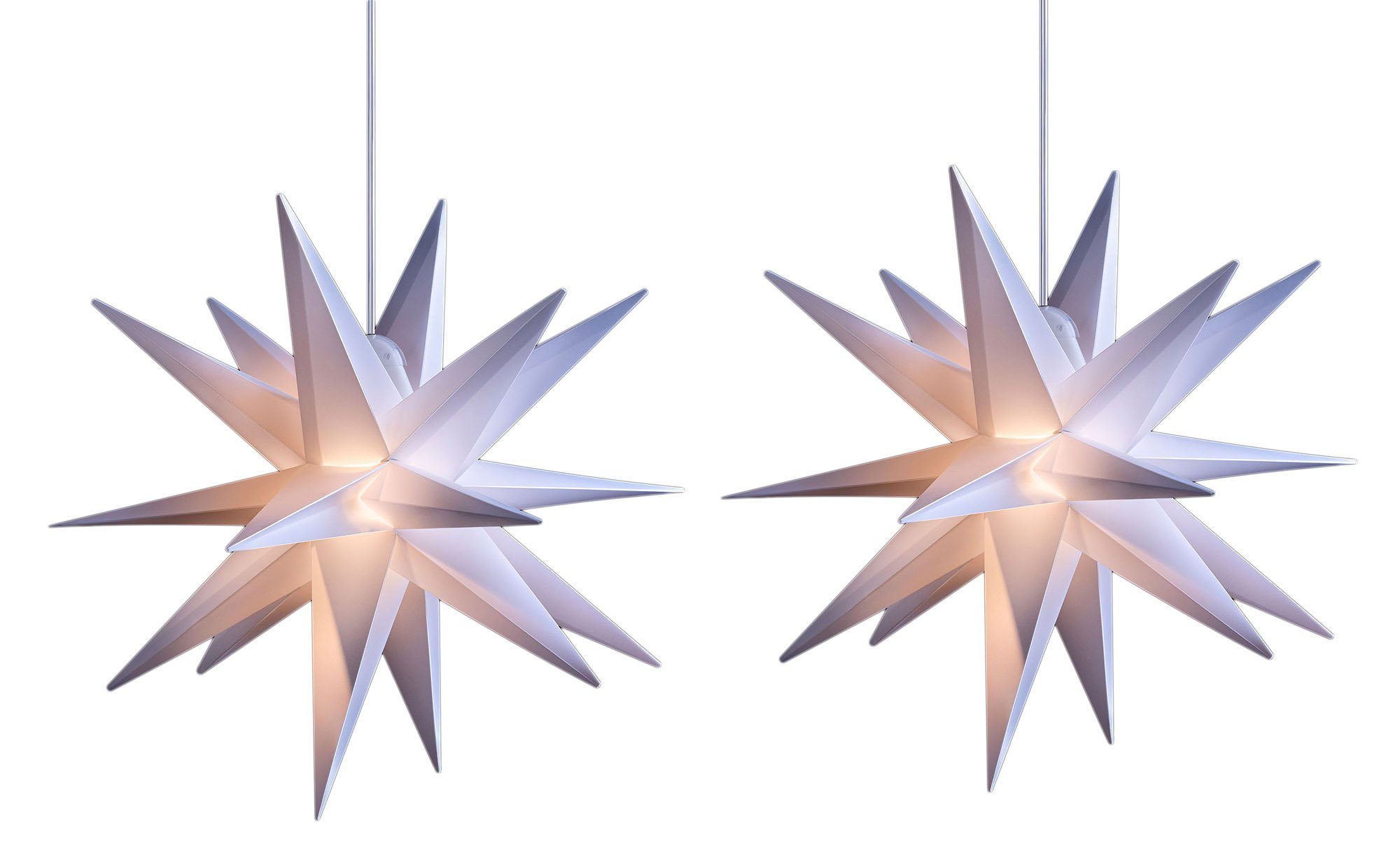 Holen Sie sich mit diesem leuchtenden Stern Licht und Freude in der winterlichen Jahreszeit in Ihr Heim. Er ist die typische Weihnachtsdekoration. Sie können diesen Dekostern ganz einfach drinnen oder draußen nutzen. Er ist aus wetterfestem Kunststoff hergestellt und besitzt ein 4 Meter langes Kabel. Zum Befestigen können Sie den angebrachten Aufhänger verwenden. Außerdem brauchen Sie keine unnötigen Steckerleisten, welche nur ein Sicherheitsrisiko darstellen. Nehmen Sie den Stern aus der Verpackung heraus und falten Sie ihn auf. Er besteht aus einem komplett gefalteten Stück. Drücken Sie die Zacken eventuell sanft ein, um die Spitzen voneinander zu lösen. Bringen Sie das Stromkabel in der Führung an und befestigen Sie das Leuchtmittel in der Halterung. Drehen Sie es hier bitte vollständig hinein. Klappen Sie den Stern nun ganz zu und sichern ihn mit den beiden Schiebeklammern. Hängen Sie den Stern nun an den gewünschten Ort. Material: Wetterfester Kunststoff Ausführung: 3D-Optik - 18 Zacken, Größe: Ø ca. 65 cm Farbe: Weiss Ohne Leuchtmittel – Glühbirnen verwenden bis 15 Watt Sockel: E14 Energieeffizienzklasse: A++ Inklusive bebilderter Aufbauanleitung und 4 Meter langem schwarzem Kabel samt integriertem Beleuchtungsmittelhalter für das Leuchtmittel Anwendung Innen: Der leuchtende Stern im Wohnzimmer als Lichtquelle an den Fenstern… … im Kinderzimmer als Nachtlicht für Ihre Liebsten … als wunderschönes Licht für ein angenehmes Ambiente … im Flur als Nachtlicht für nächtliche Ausflüge Anwendung Außen: Der leuchtende Stern auf dem Balkon oder auf der Terrasse … als wunderschönes Licht im Garten für ein angenehmes Ambiente … als Verschönerung der Fassade Ihres Hauses