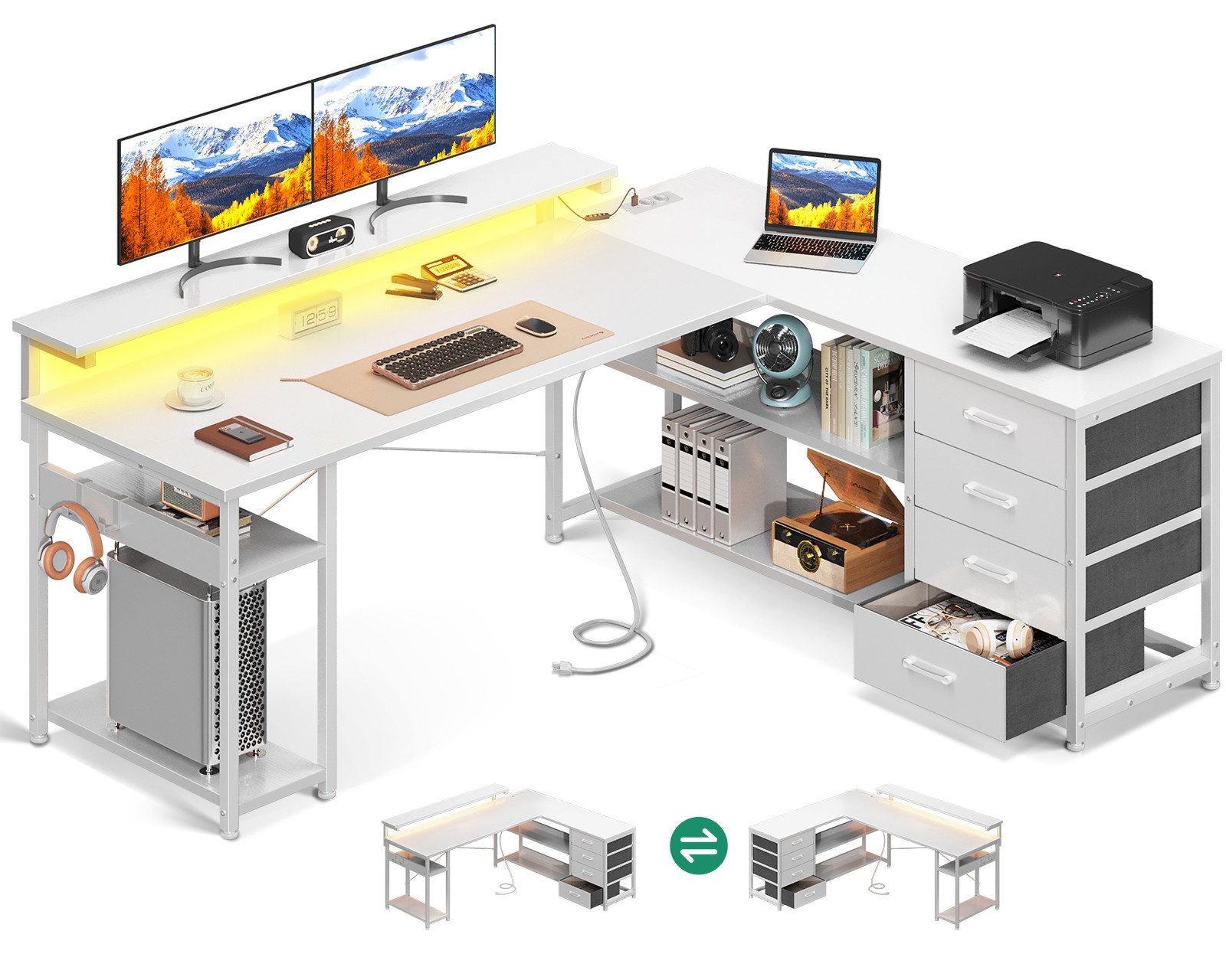 Reversible Eckschreibtisch mit 2 Steckdosen und 2 USB-Ladeanschlüssen, L-Form Bürotisch mit LED-Beleuchtung für Home Office, Maße: 155×110 cm, Farbe: Всіs Weiß.