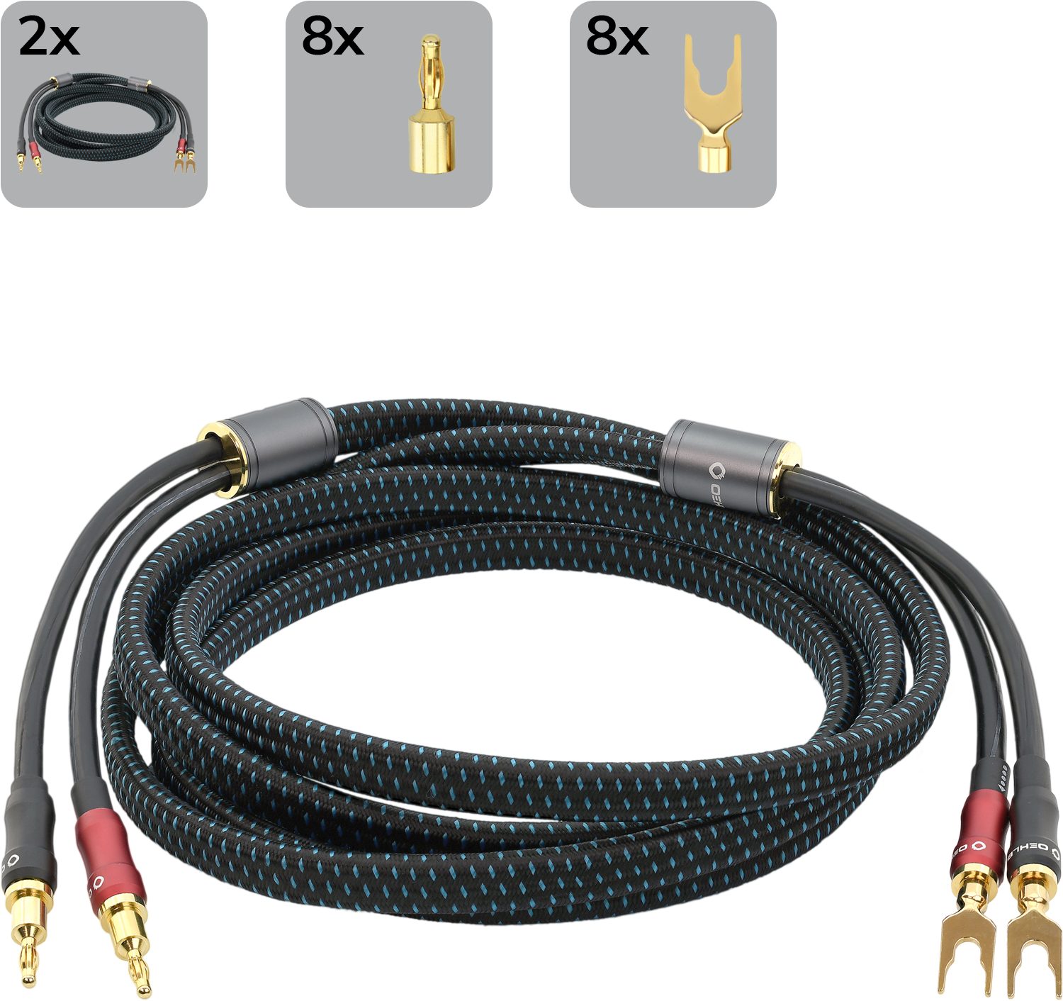 Eigenschaften | - Zwei Kabelstränge aus je vier einzeln verseilten Einzellitzen aus OFC Kupfer- 6mm² Querschnitt, 300W- hochwertiger Gewebemantel- hervorragende Leitfähigkeit und besonders geringer Widerstand- Schraubgewinde mit zwei verschiedenen Adaptern- 2x Bananenstecker und 2x Kabelschuh (im Lieferumfang enthalten)- Schraubgewinde und Adapter mit 24ct Gold |