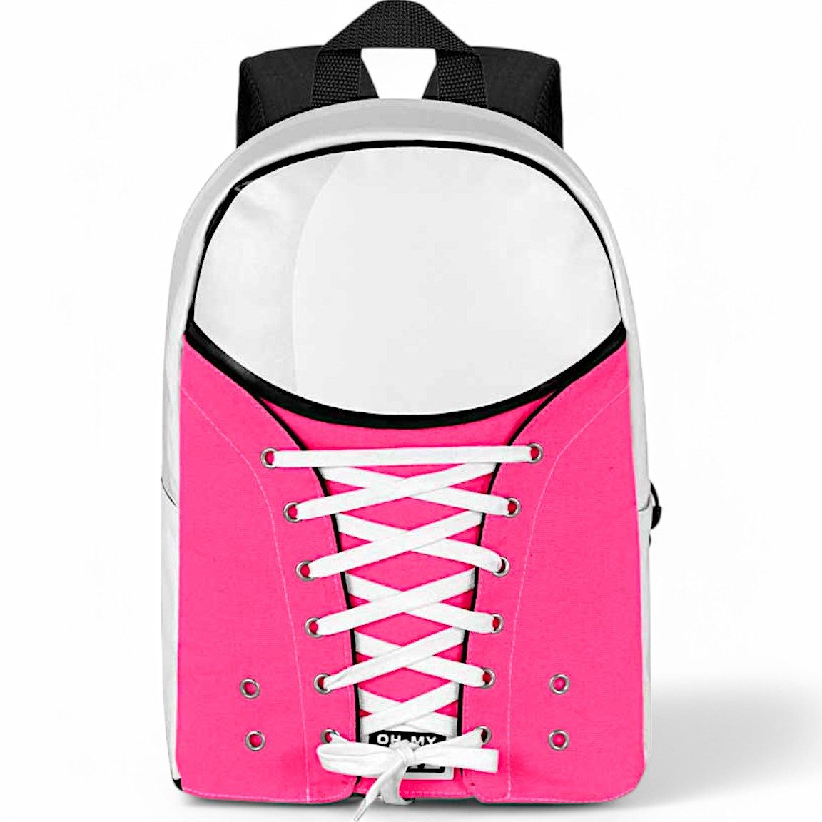 Pink Sneakers Backpack bringt Farbe in deinen Alltag! Sein kreatives Design in leuchtendem Pink mit weißen Schnürdetails erinnert an deinen Lieblingssneaker.