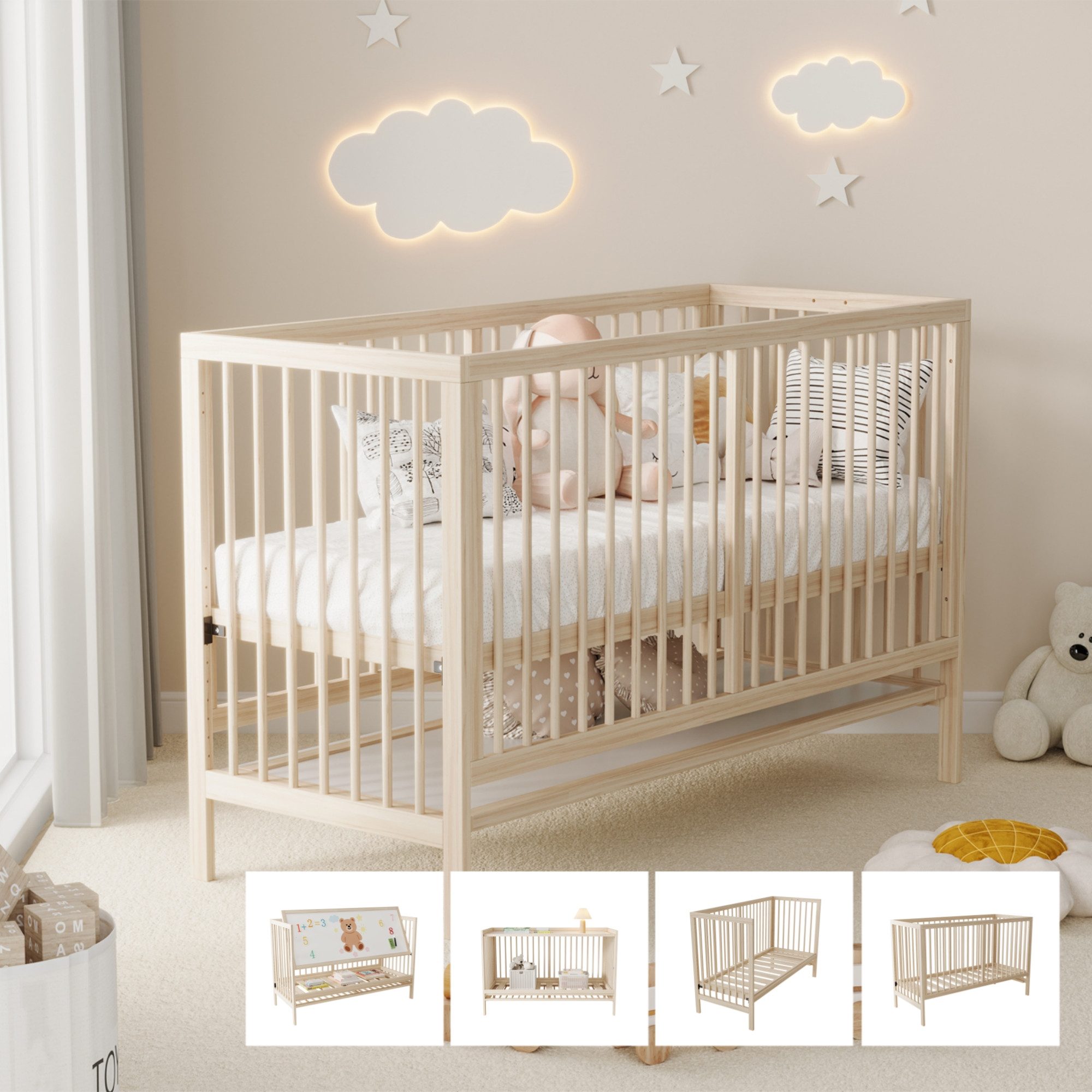 Das multifunktionale Babybett aus hochwertigem Fichtenholz bietet Sicherheit und Stabilität für Ihr Baby. Mit einer Tragfähigkeit von bis zu 100 kg und einer natürlichen Holzfarbe schafft es einen gesunden Raum.