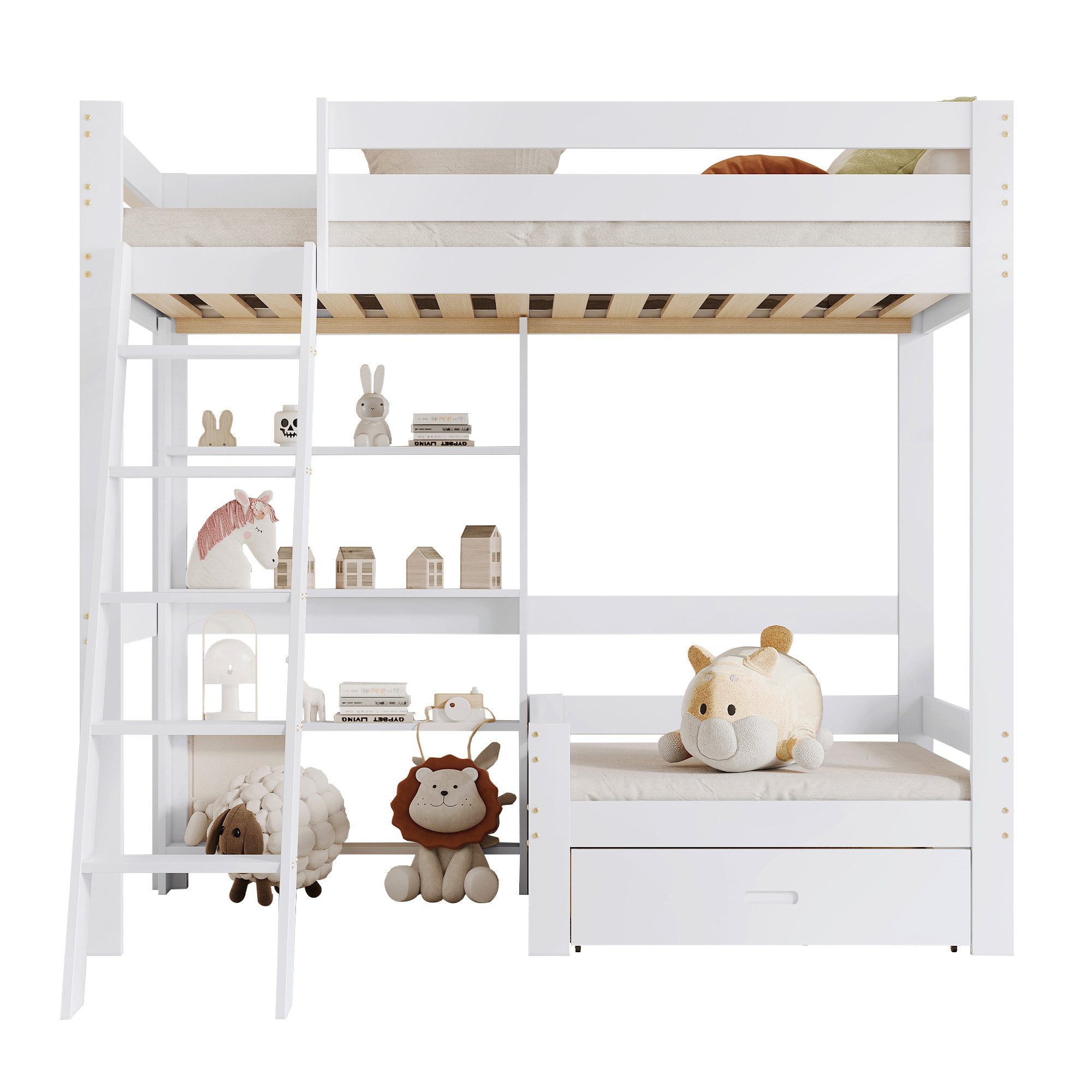 Dieses Etagenbett ist ein wahres Multitalent. Es bietet eine Reihe von Funktionen wie ein Sofa, Regale, eine schräge Leiter und Schubladen, die es zu einem vielseitigen Möbelstück machen. Nutzen Sie es als bequemes Bett, als gemütliches Sofa oder als praktischen Stauraum – dieses Möbelstück bietet eine Fülle an Möglichkeiten, um den Raum optimal zu nutzen.