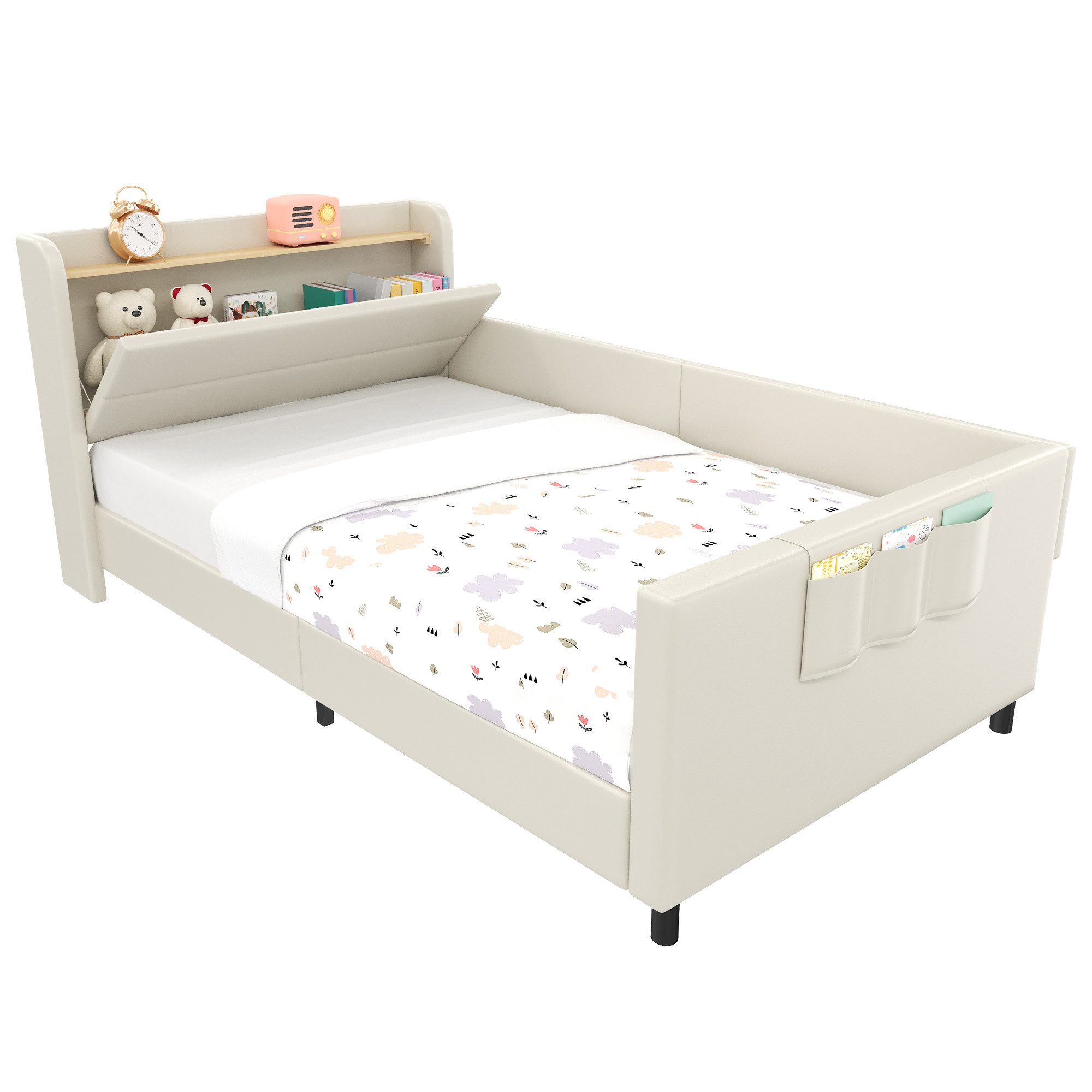 Das Bett verfügt über großzügigen Stauraum am Kopf- und Fußende, perfekt für alles, was Ihr Kind braucht. Zusätzlich bieten die drei kleinen Aufbewahrungstaschen an den Seiten des Bettes zusätzlichen Platz für Spielzeug, Bücher oder andere Kleinigkeiten. Der Nachttisch mit einer praktischen Klapptür sorgt für noch mehr Stauraum und hilft, das Schlafzimmer ordentlich und organisiert zu halten.