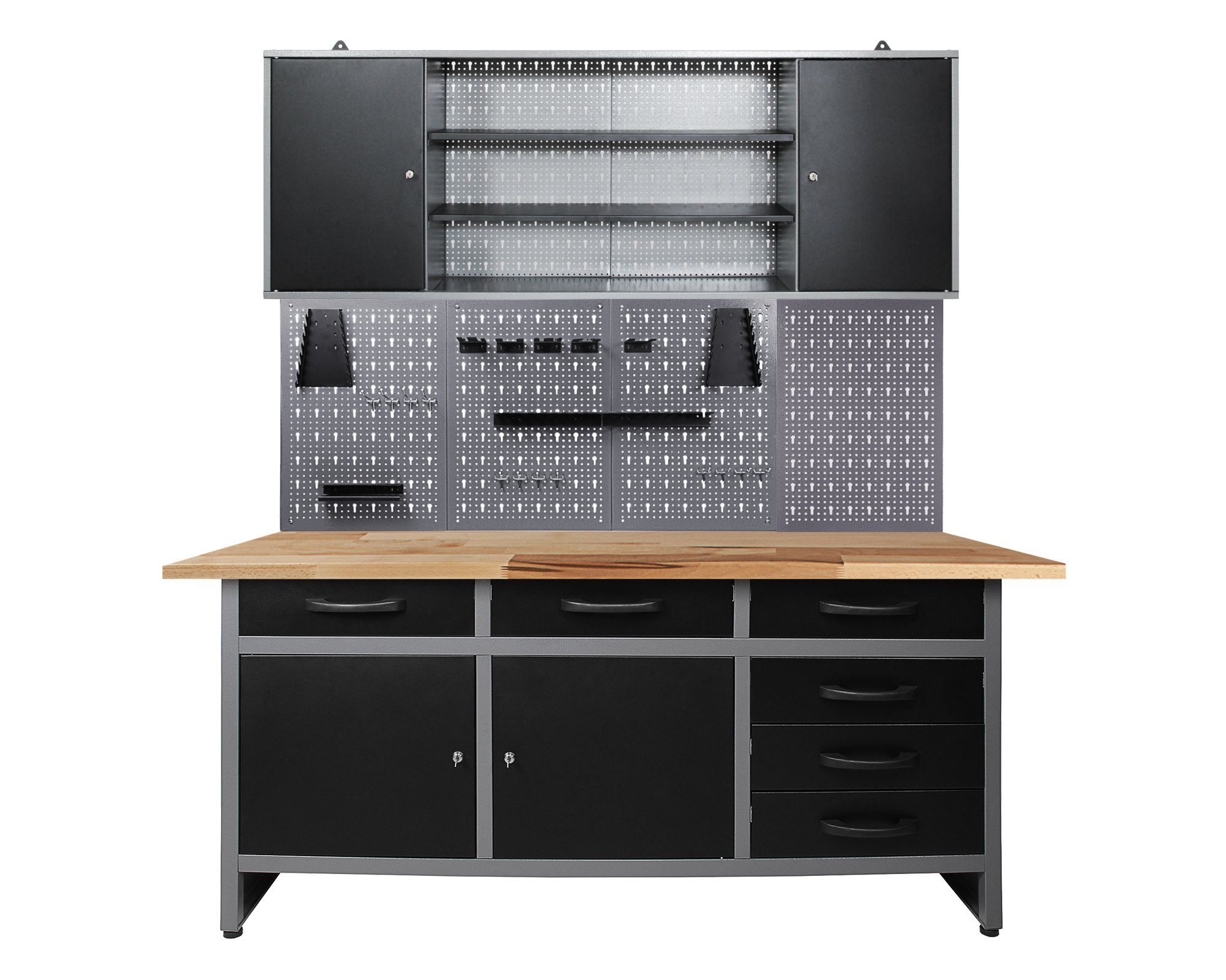 Werkstatteinrichtung 160 cm - Arbeitshöhe 85 cm - bestehend aus 1 x Werkbank (Karsten), 1 x Werkstattschrank (160 cm), 4 x Lochwand, 1 x Lochwandhaken-Set