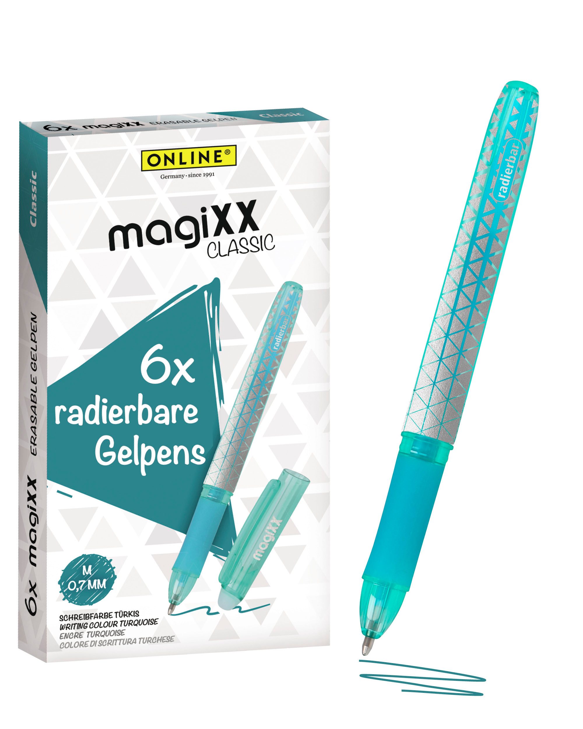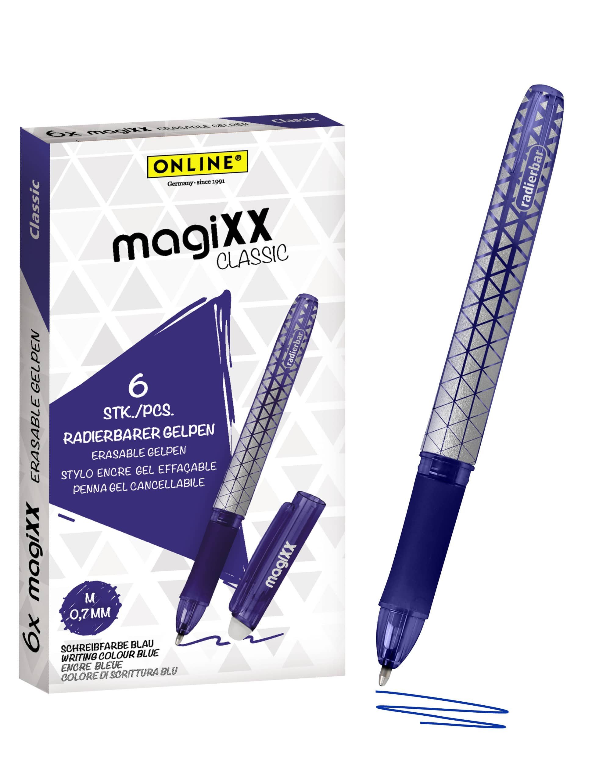 Das 6- er Pack radierbare Stifte gibt es in verschiedenen Farben. Perfekt zum Schreiben lernen und kreativen Gestalten. Das ergonomisch-klassische Design passt ideal in den Alltag und ins Büro. Die austauschbare Mine mit bleifreier Edelstahlspitze mit Metallkugel für besonders lange Haltbarkeit, ist kompatibel mit Magixx radierbarer Gelschreiber der Marke ONLINE sowie Pilot FriXion Ball pen.