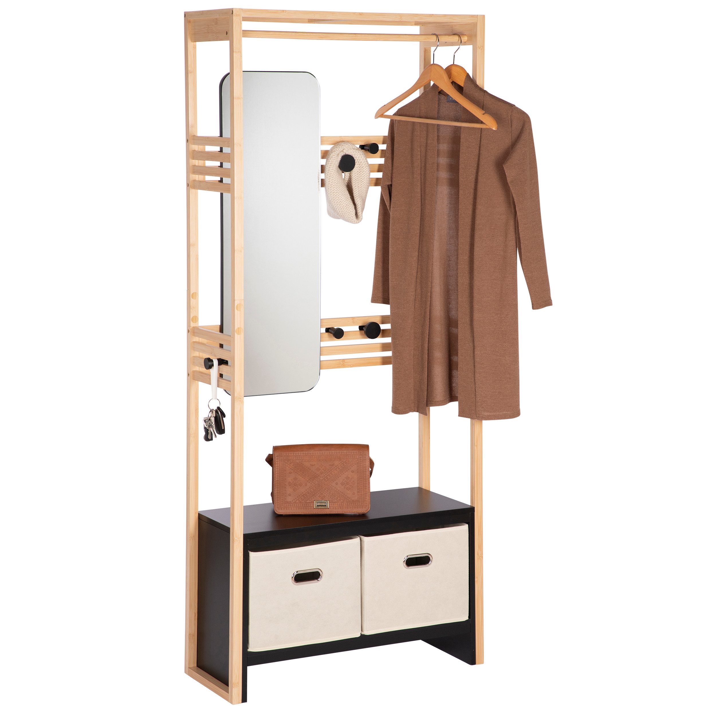 Der Garderobenständer mit Spiegel verfügt über eine Kleiderstange, Haken sowie eine Sitzbank mit Aufbewahrungsboxen, die reichlich Stauraum für Jacken, Mäntel und Mützen bieten