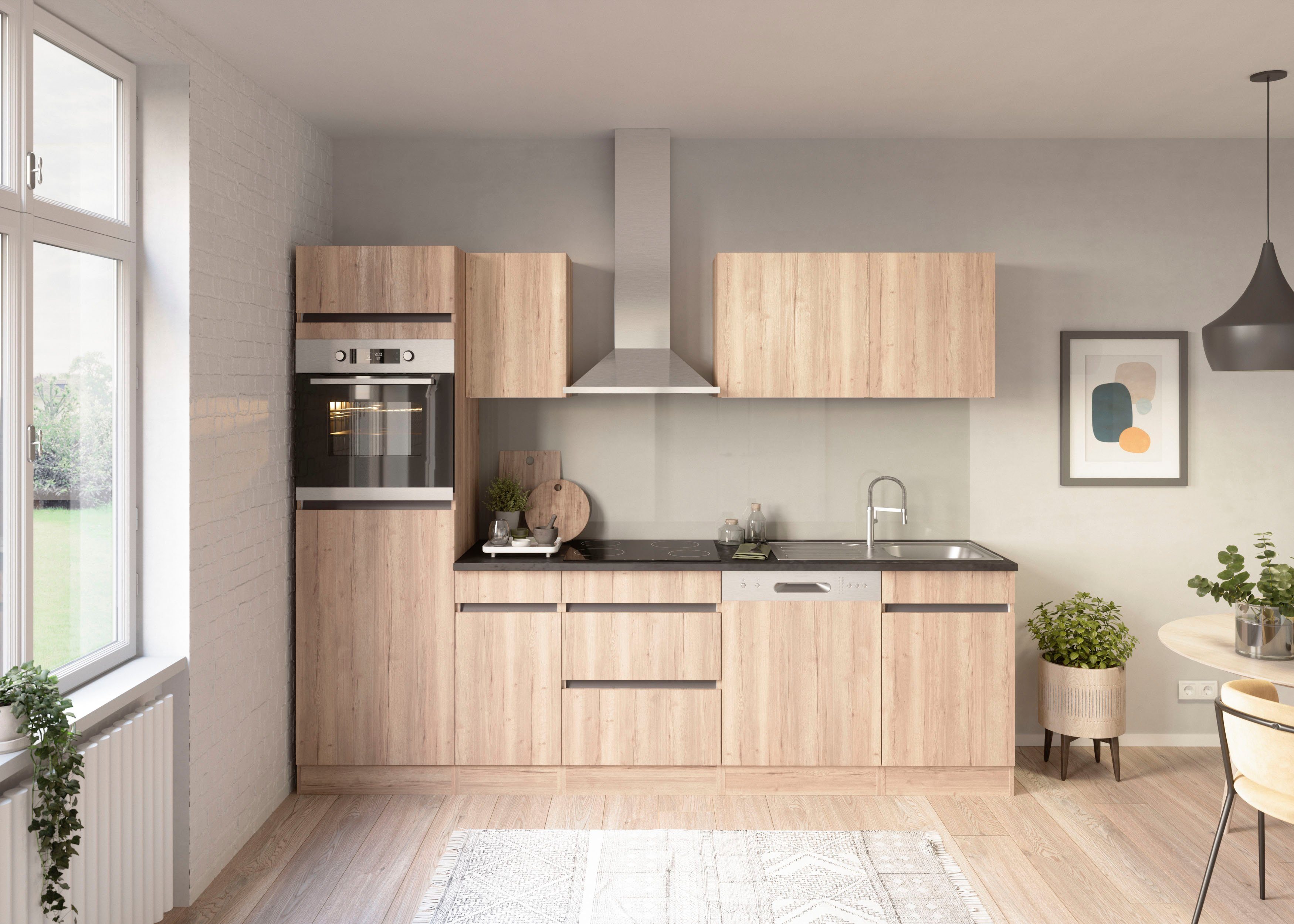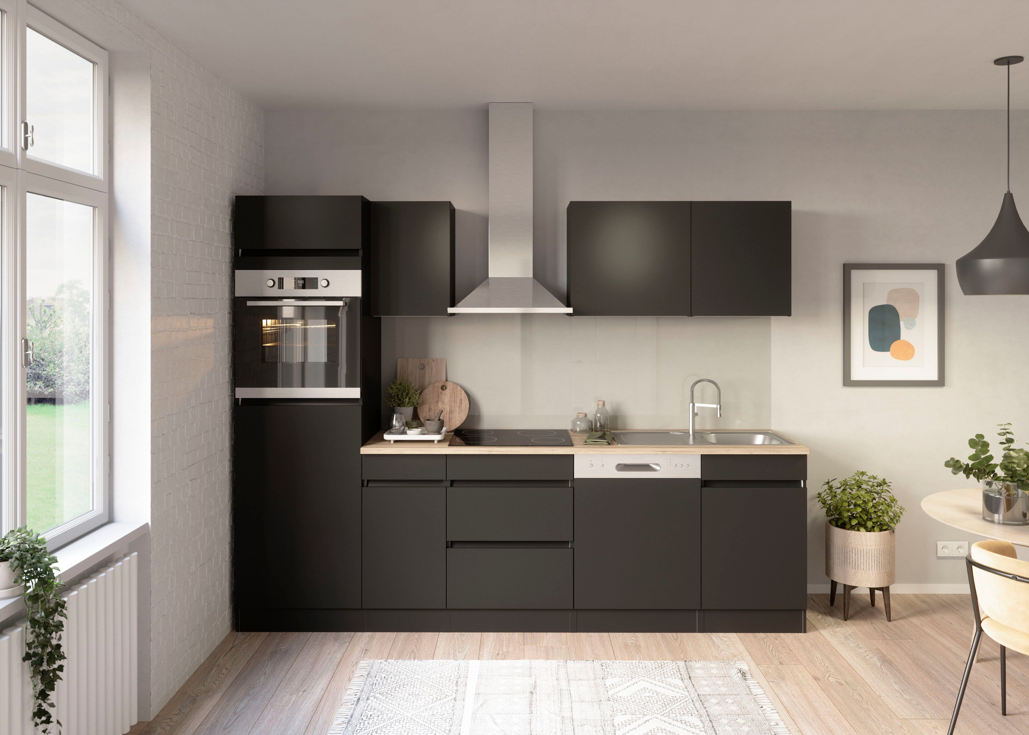 Ausstattung | Durchgehende Arbeitsplatte Grifflose Optik Türen wahlweise rechts/links montierbar inkl. Edelstahl-Einbauspüle, mit Abtropffläche ohne E-Geräte |