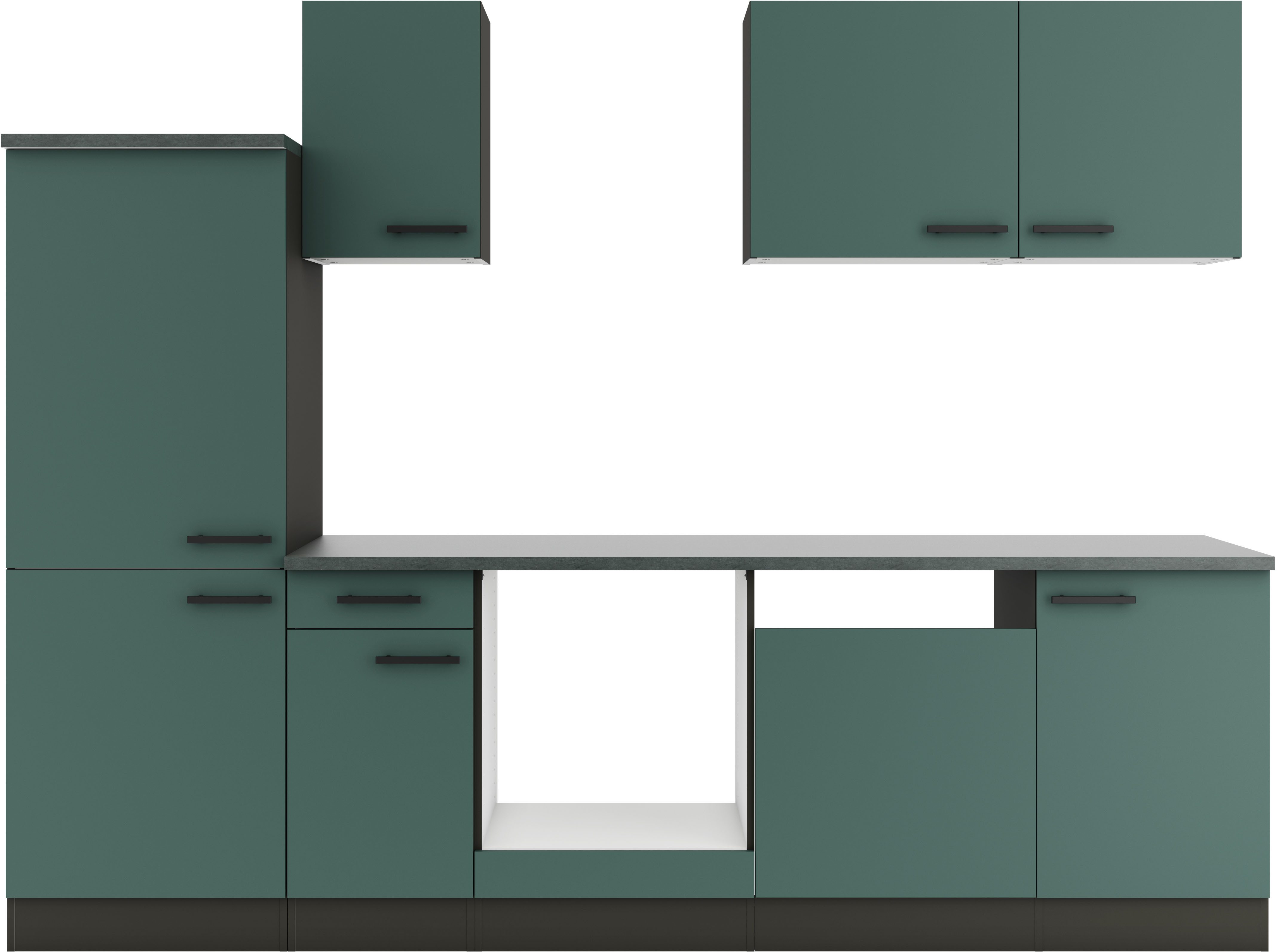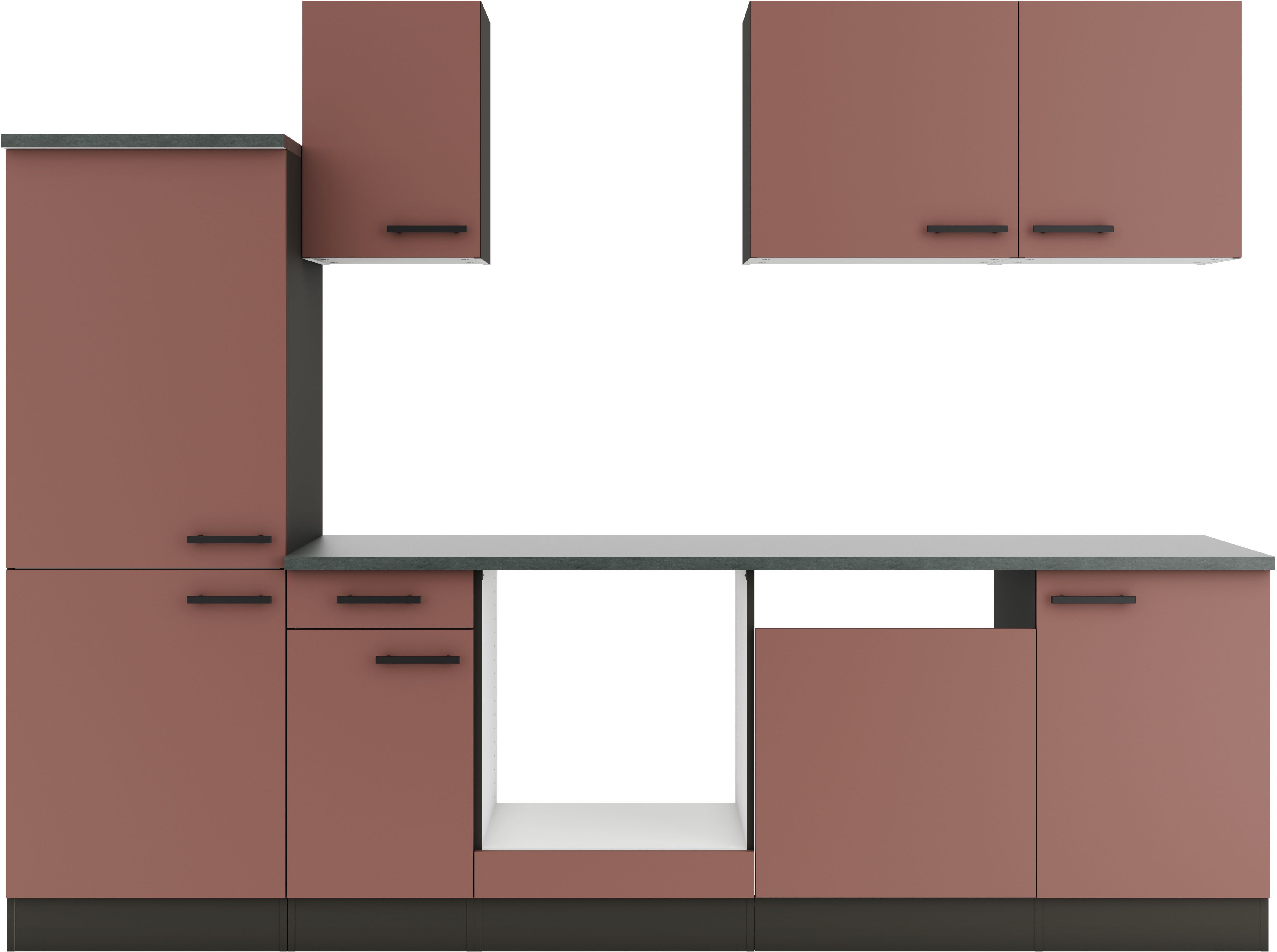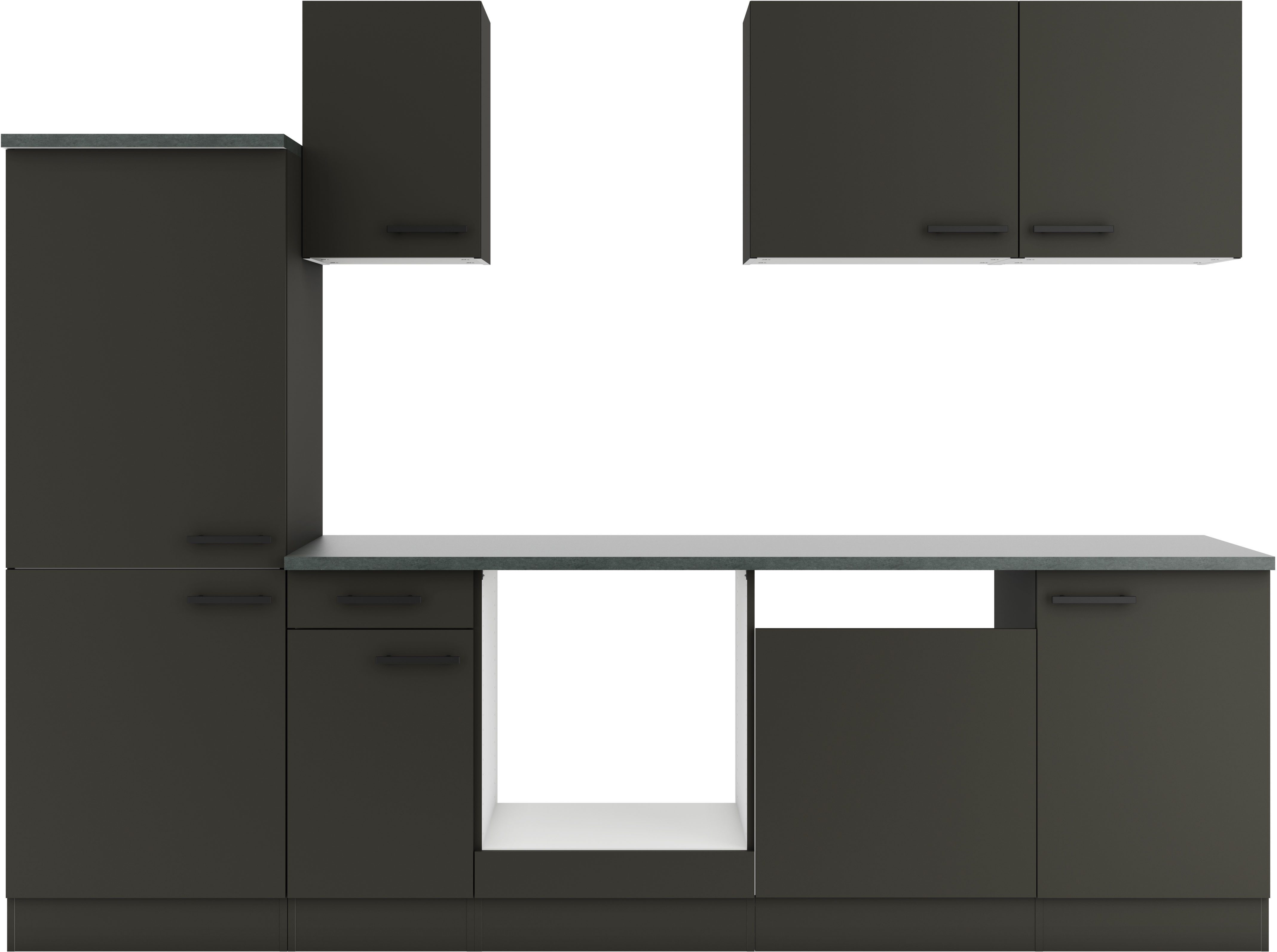 Ausstattung | Durchgehende Arbeitsplatte Einlegeböden höhenverstellbar Laufleisten der Schubkästen aus Metall Metallgriffe Seitenverkehrt stellbar Sockelhöhe nicht verstellbar Türen wahlweise rechts/links montierbar inkl. Edelstahl-Einbauspüle, mit Abtropffläche |