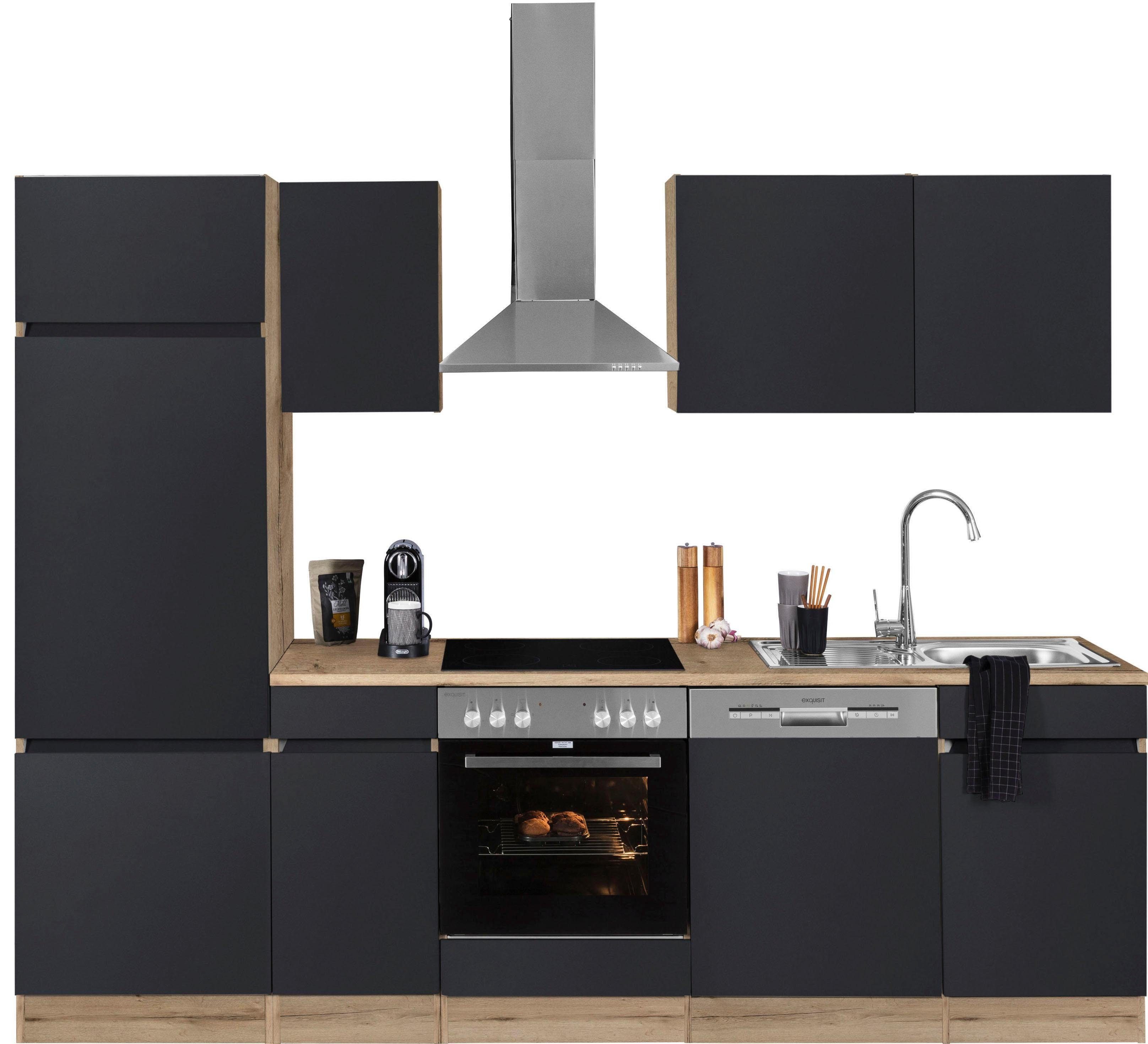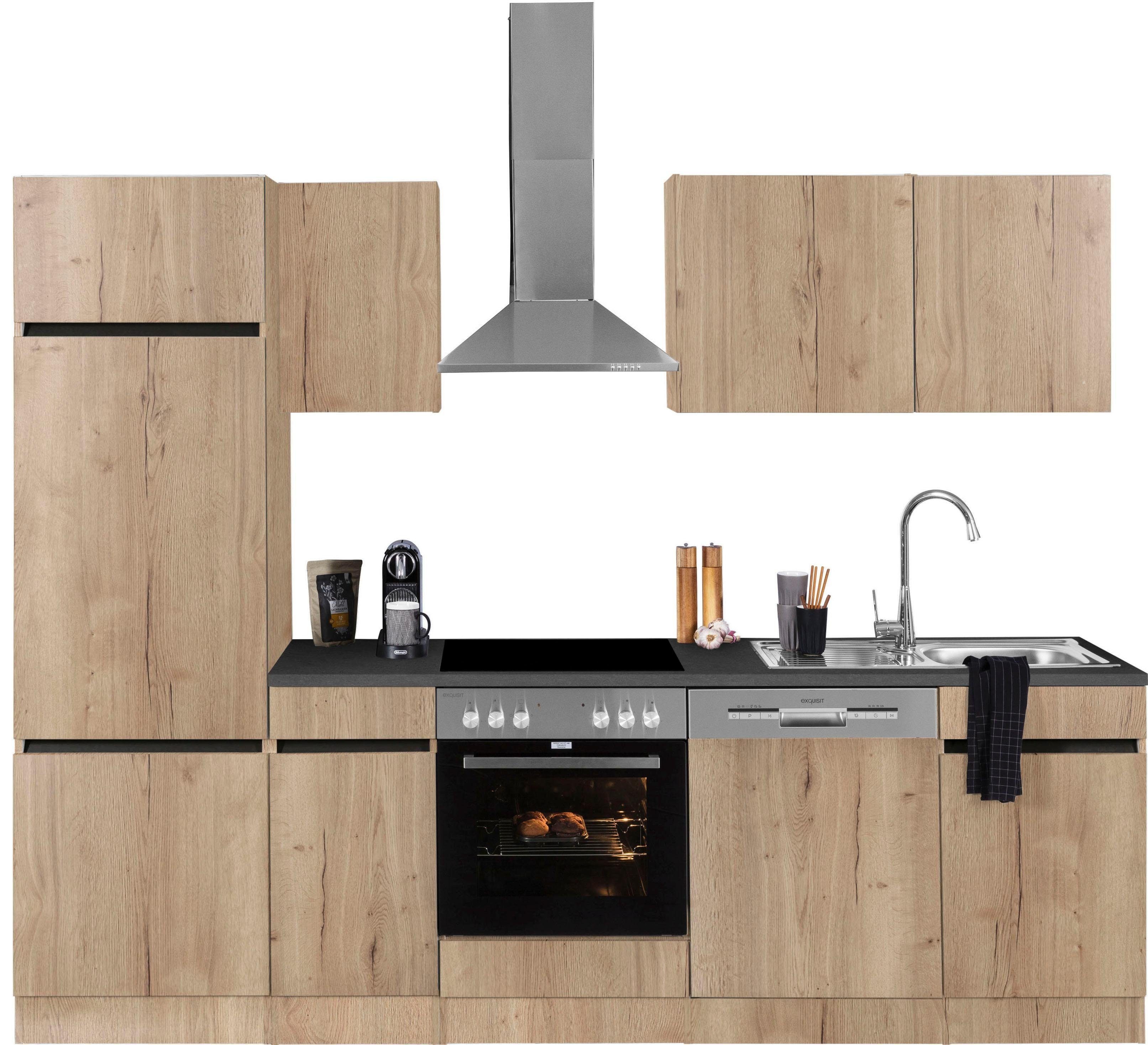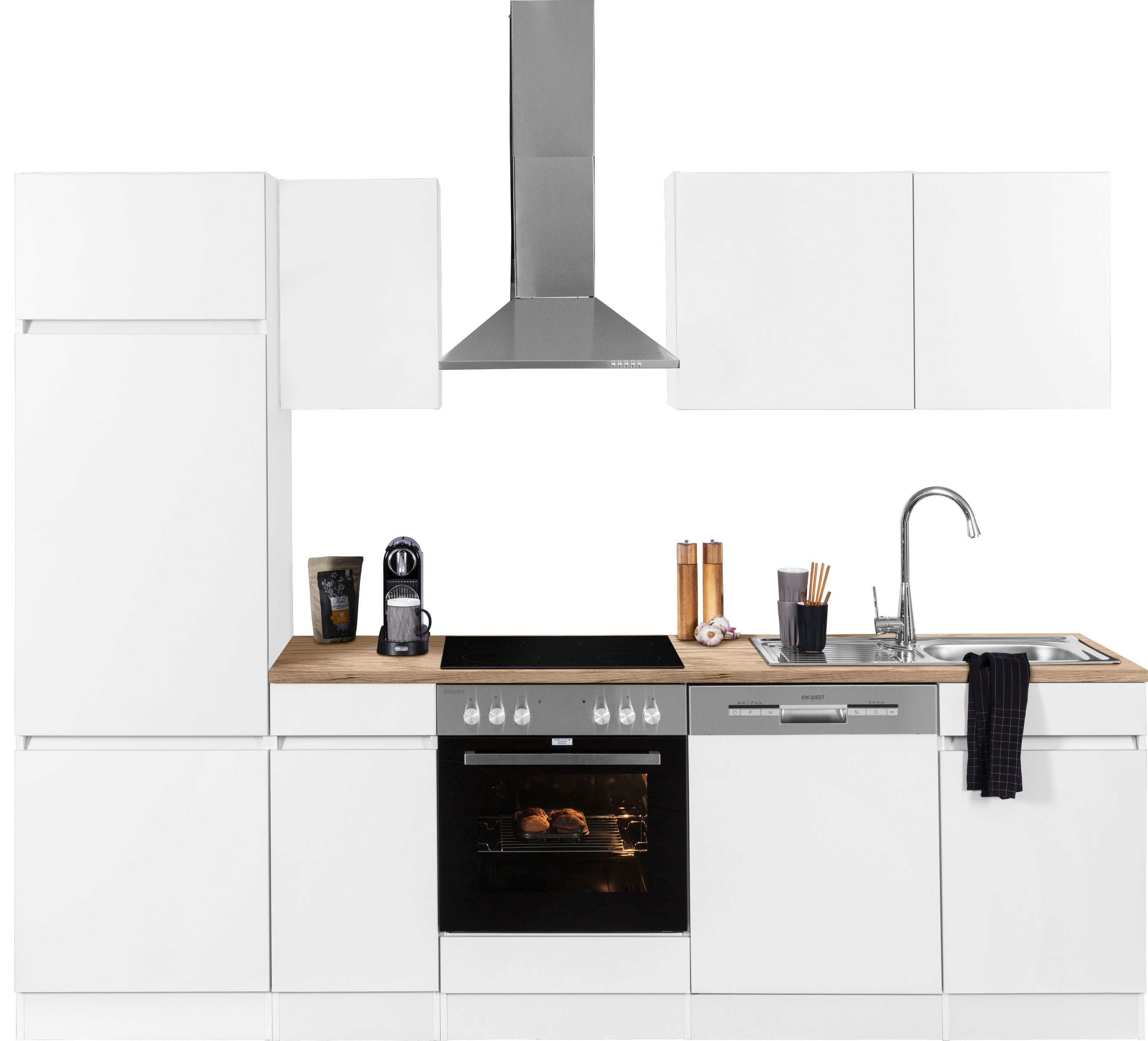Ausstattung | Durchgehende Arbeitsplatte Einlegeböden höhenverstellbar Grifflose Optik Seitenverkehrt stellbar inkl. Edelstahl-Einbauspüle, mit Abtropffläche |