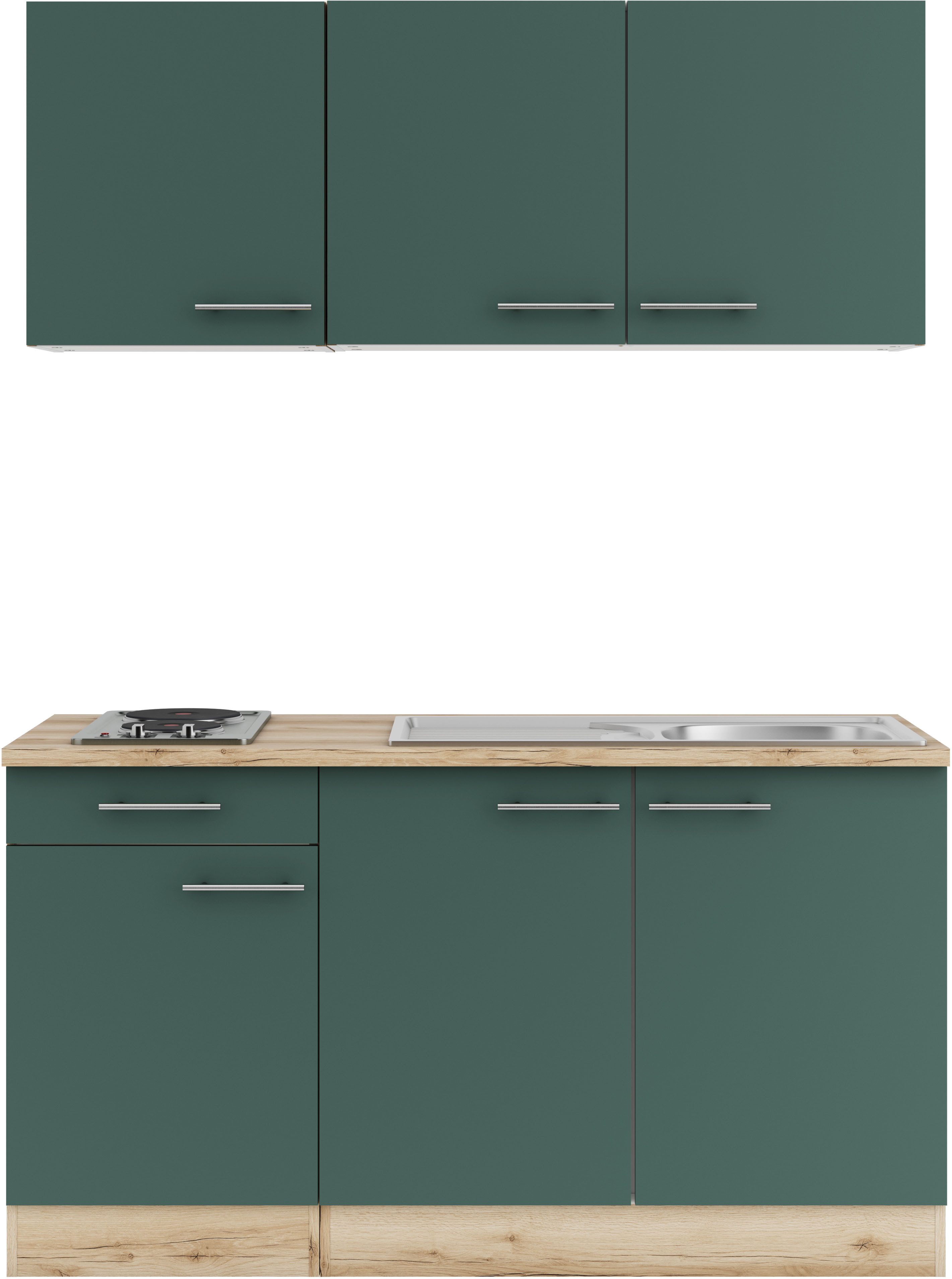 Ausstattung | Durchgehende Arbeitsplatte Einlegeböden höhenverstellbar Laufleisten der Schubkästen aus Metall Metallgriffe Seitenverkehrt stellbar Sockelhöhe nicht verstellbar Türen wahlweise rechts/links montierbar inkl. Edelstahl-Einbauspüle, mit Abtropffläche |