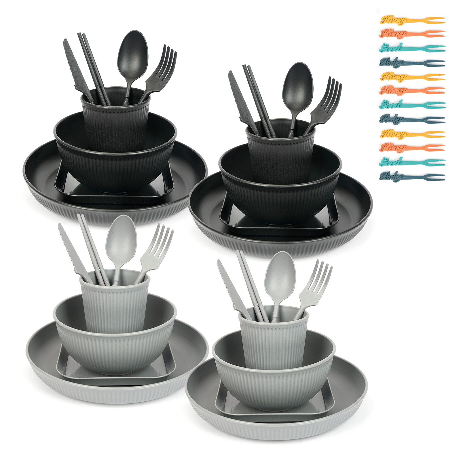 44 teiliges Campinggeschirr Set Picknick Geschirr Set für 4 Personen Unsere Picknickgeschirr Set sind in verschiedenen Farben erhältlich und das perfekte Familienset, es ist sehr gut für Familien und Kinder geeignet. Das Campinggeschirr Set ist perfekt für jede Mahlzeit und dient zum Servieren von Pasta, Sandwich, Brot und Butter, Dessert, Suppe, Reis, Salat, Vorspeise usw. Besteckset für 4 Personen mit 2 Farben in blau und grün Das Paket enthält: 8*Teller, 4*Schüsseln, 4*Tassen, 4*Strohhalme, 4*Bestecksets, 12*Fruchtgabeln. Hohe Qualität: PP sicher, wiederverwendbar, langlebig, lebensmittelechtes Material aus Kunststoff, entworfen mit glatten runden Kanten. Picknickgeschirr Set: Matte Textur, glatten runden Kanten, die Ihnen eine gute Note geben, es hat die Wellen im Inneren. Verdickter aber leichter Picknickgeschirr ist unzerbrechlich. Das Geschirr Set ist für den täglichen Gebrauch geeignet, um das Frühstück, Mittag- und Abendessen Ihrer Familie zu erfüllen. Leicht zu renigen: Waschen das Besteckset mit Wasser und Seife von Hand. Für Spülmaschinengeeignet, Mikrowelle-und Kühlschrank sicher. Besonderheit: Leichtgewicht für alle Altersgruppen, Wiederverwendbar, Unzerbrechlich, Stapelbar (Schränke/Schublade Platz sparen)
