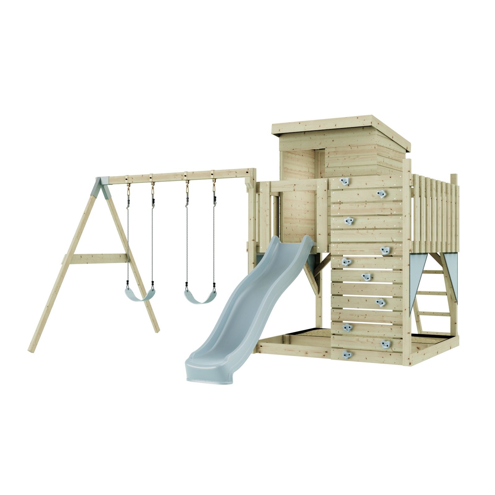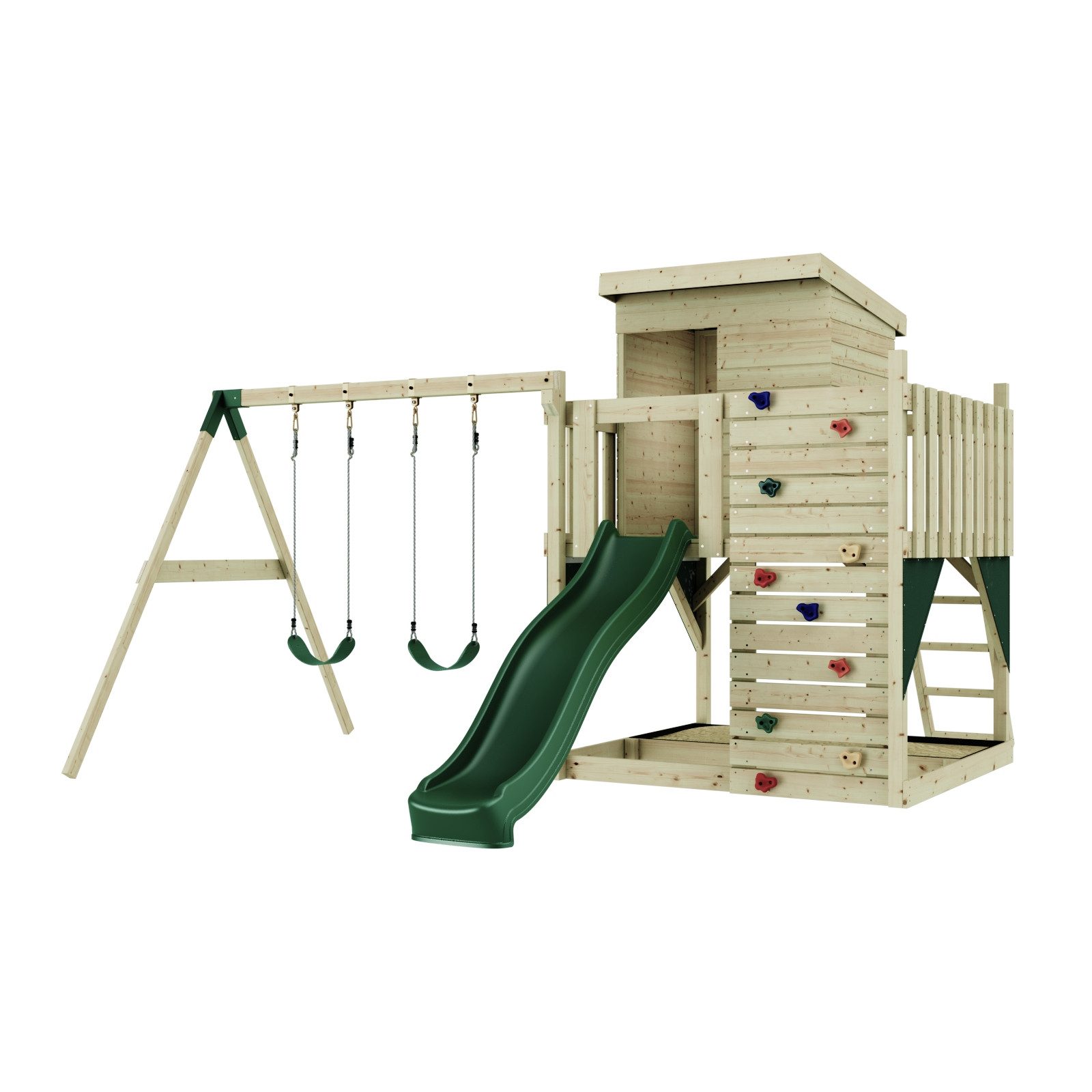 Herzlich willkommen im märchenhaften OutdoorToys Spielturm Björn! Dieser entzückende Spielturm mit einem gemütlichen Häuschen auf der Plattform und einer schwingenden Doppelschaukel wird nicht nur kleine Herzen erobern, sondern auch deinen Garten in zauberhafte Pastellfarben tauchen. Der Bereich unter dem Spielturm kann als Sandkasten genutzt werden. , Stabile Konstruktion aus unbehandeltem Holz Modernes Spielhaus Spritzgegossene Wellenrutsche Aufstiegsleiter auf die Plattform Höhenverstellbare Schaukelseile Pulverbeschichtete &, verzinkte Schaukelaufhängungen , Produktdetails des OutdoorToys Spielturms: Doppelschaukel 50 kg Maximalgewicht Довжина: 396 cm Höhe: 261 ,cm Breite: 415 ,cm 120 cm Plattformhöhe 220 cm Rutschenlänge Farbe: Mintgrün Ausführung: Trapezstange Sicherheitshinweise: Nicht für Kinder unter 3 Jahren geeignet Nur für den Haus-/Privatgebrauch geeignet Benutzung nur unter unmittelbarer Aufsicht von Erwachsenen Montagehinweise: Das Holz ist nicht vorgebohrt, eine vollständige Anleitung liegt bei der Lieferung bei. Für die Befestigung des Artikels sind Bodenanker notwendig. Diese kannst du hinzufügen, nachdem das Produkt in den Warenkorb gelegt wurde. Alternativ findest du unsere Bodenankersets unter Upgrades &, Zubehör. Benutzungshinweis: Dieses Produkt wurde in Übereinstimmung mit der Spielzeugsicherheitsverordnung DIN EN 71 entworfen und hergestellt. Всі angegebenen Maße und gezeigten Farben können geringfügig abweichen.