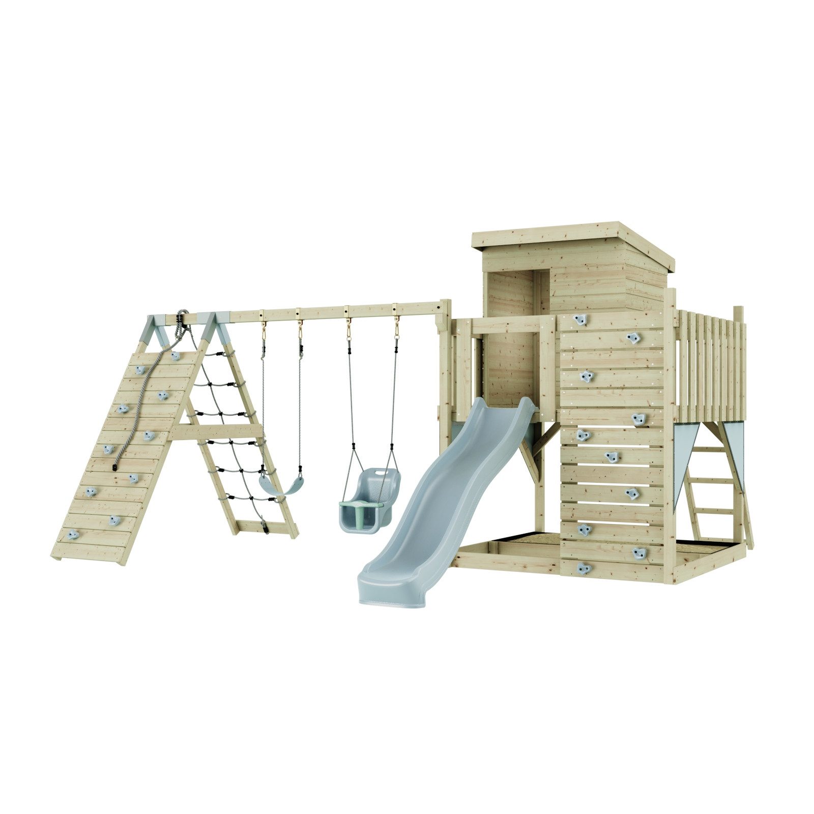 Der Spielturm überzeugt durch eine stabile Verarbeitung aus unbehandeltem Massivholz (Fichte) und wird so zum langlebigen Begleiter im Garten. Liebevolle Details wie die spritzgegossene Wellenrutsche, Aufstiegsleiter, die verzinkten, pulverbeschichteten Schaukelaufhängungen sowie die höhenverstellbaren Schaukelseile sorgen für Sicherheit und Komfort.