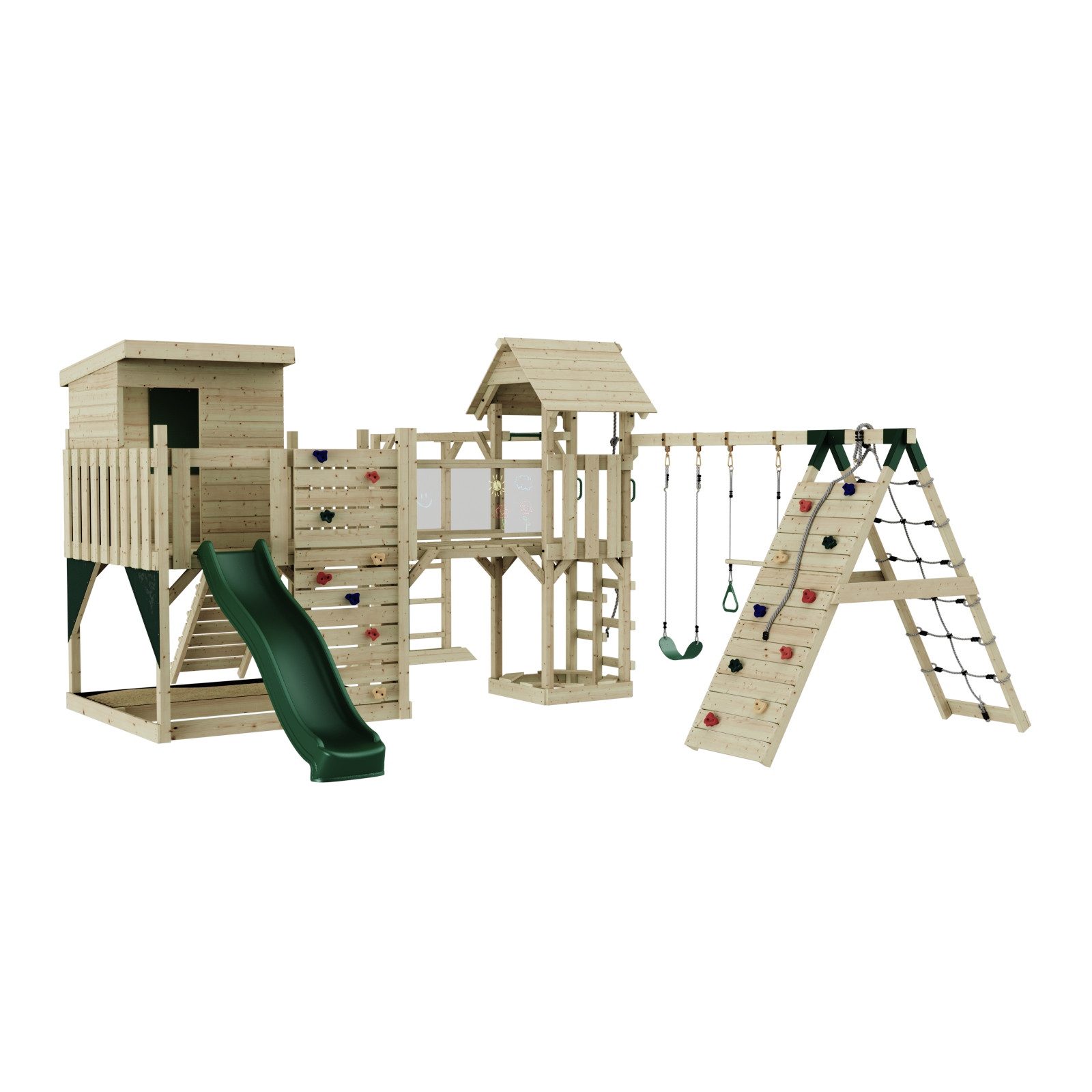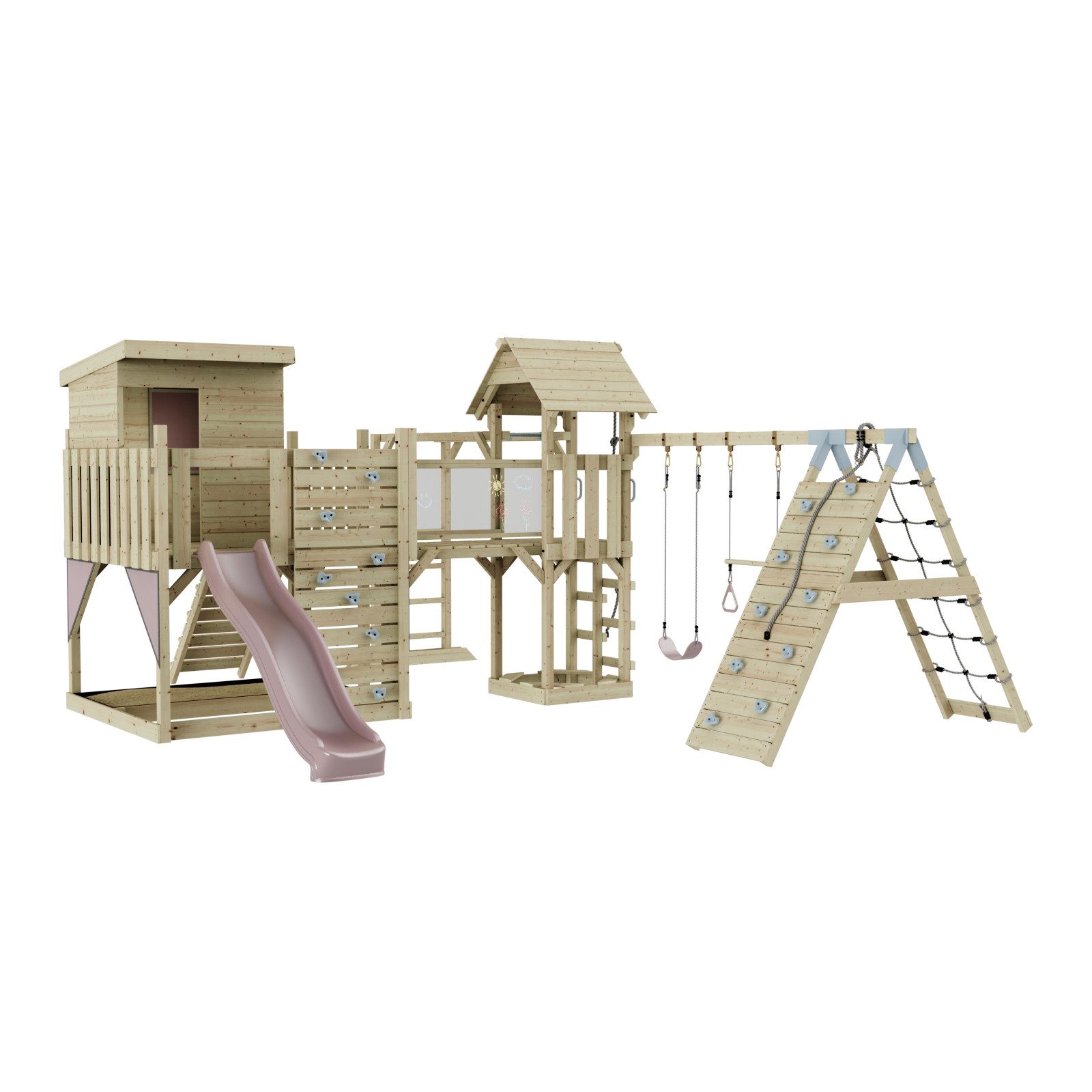 aus Holz in Mintgrün mit Kinderschaukel & Rutsche, Kletterwand