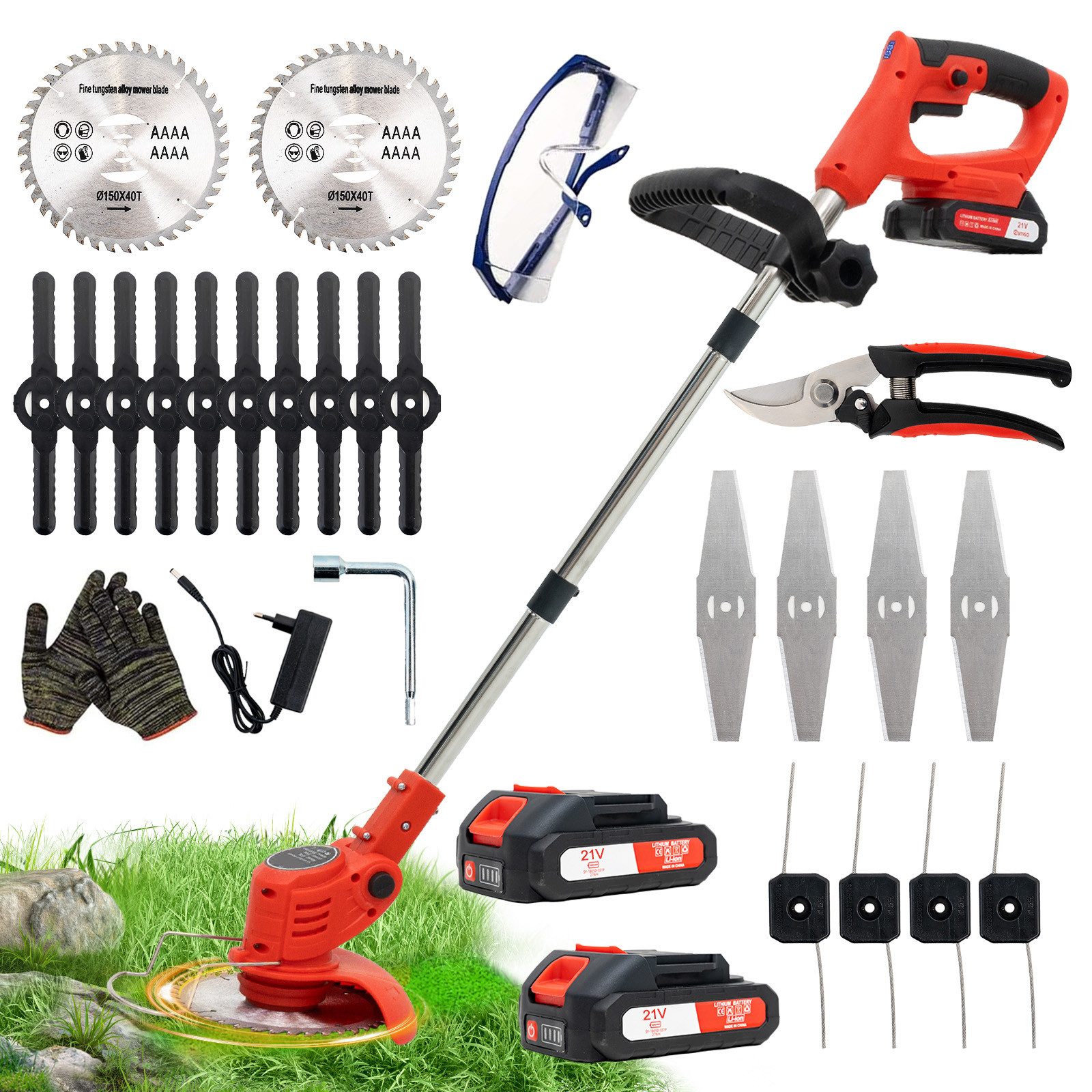 1 Akku-Rasentrimmer, 2 Akkupacks, 1 Ladegerät, 2 Diamant-Sägeblätter aus Legierung, 4 gerade Blätter, 10 Kunststoffblätter, 4 Grasseile, Handschere, ein Paar Handschuhe, Schutzbrille, Schraubenschlüssel.