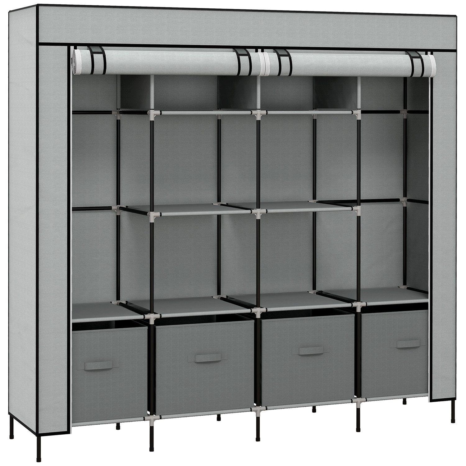 Vier bewegliche Stoffschubladen mit Griffen und zehn Aufbewahrungsfächer für gefaltete Kleidung, Taschen und Bettwäsche.