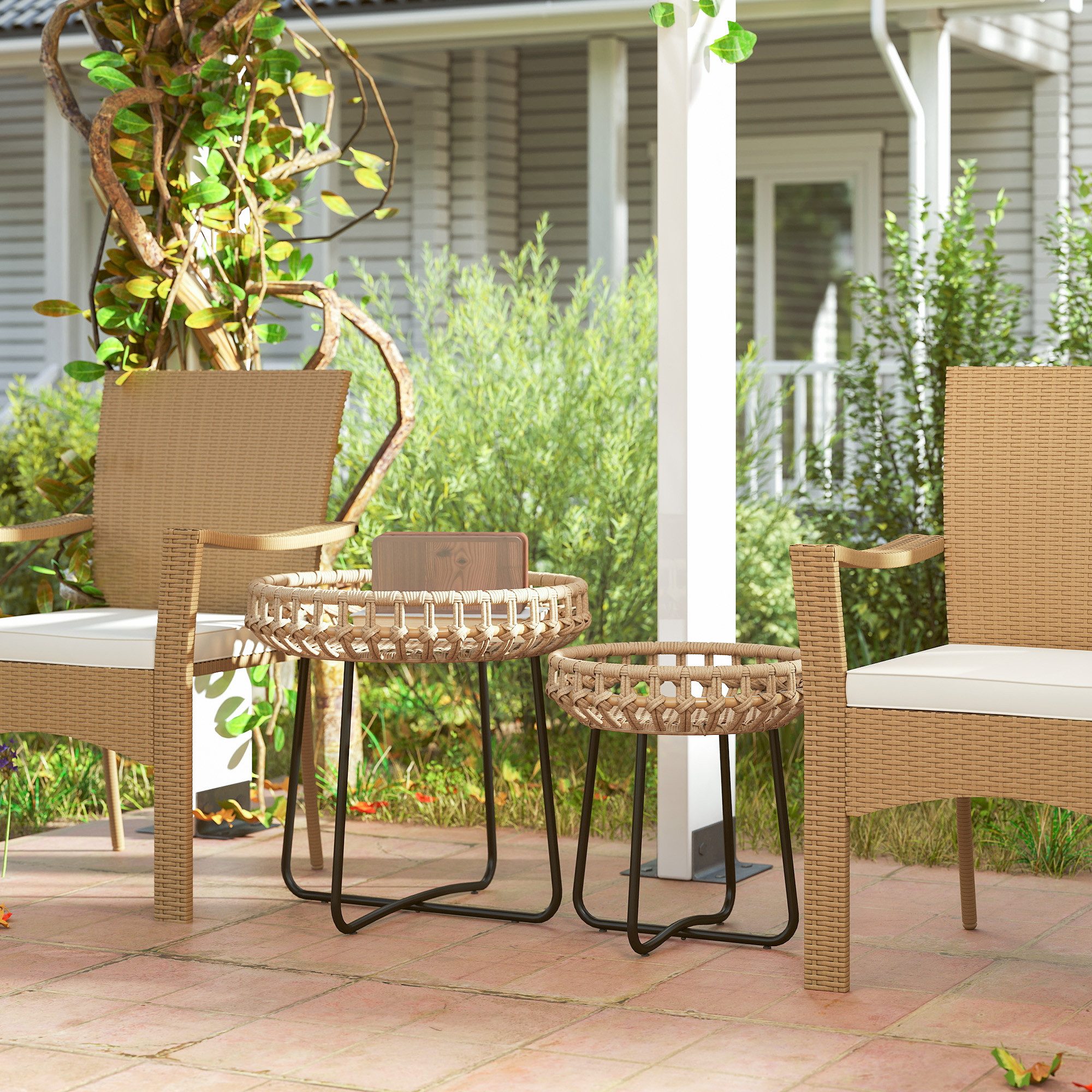 Erleben Sie die Eleganz der Outsunny kleine Rattan-Tische, das sowohl praktisch als auch stilvoll gestaltet ist. Ob gemeinsam für einen modernen Layer-Look oder einzeln aufgestellt - diese runde Rattan-Tische passen sich perfekt Ihren Bedürfnissen an. Die edle schwarze Stahlbasis und der wetterfeste Rattanbelag ergeben ein stilvolles Ensemble, das drinnen wie draußen überzeugt.