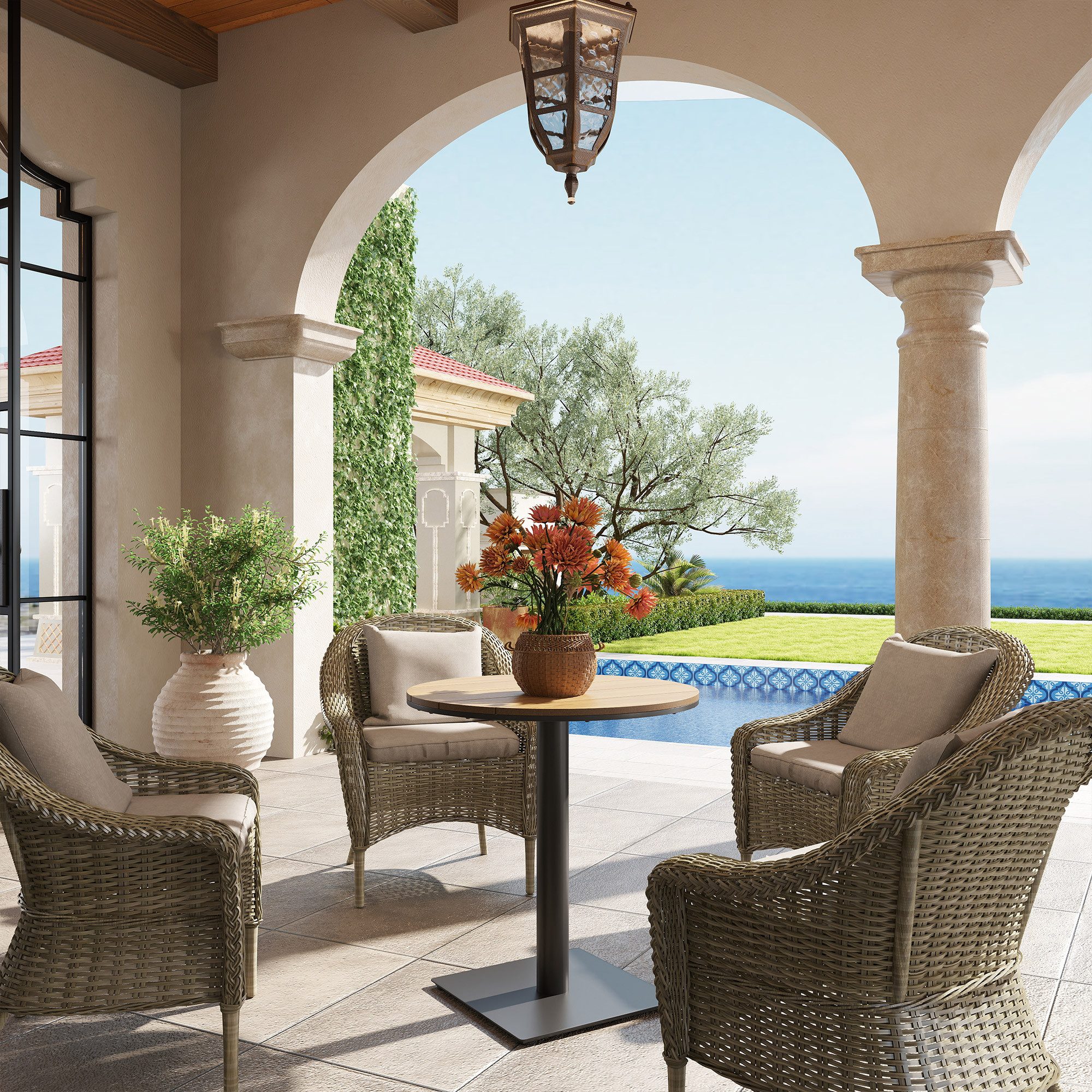 ● Der 70 cm runde, holzähnliche Tischplatte des Gartentisches bietet viel Platz für Gegenstände ● Abgerundete Kanten erhöhen die Sicherheit und reduzieren das Verletzungsrisiko ● Das lamellenartige Design der Tischplatte verhindert Wasseransammlungen ● Robuster Rahmen des Terrassentisches vereint Langlebigkeit mit Rostbeständigkeit ● Verstellbare Fußpads des Gartentisches schützen den Boden und gewährleisten Stabilität ● Vielseitig einsetzbar als Kaffee-, Bistro- oder Beistelltisch ● Maximale Belastung 30 kg, Montage erforderlich