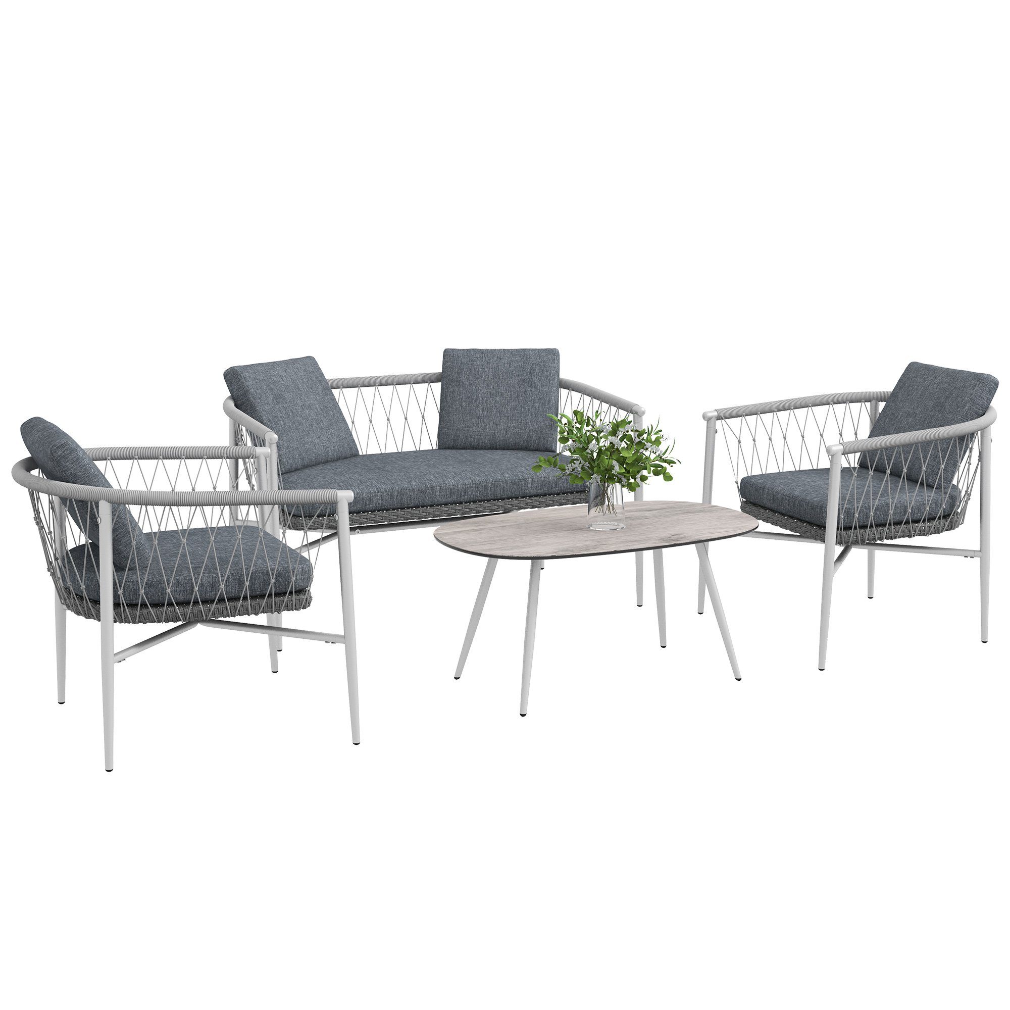 Lieferumfang | 2 Sessel, 1 Zweisitzer, 1 Couchtisch, Kissen |